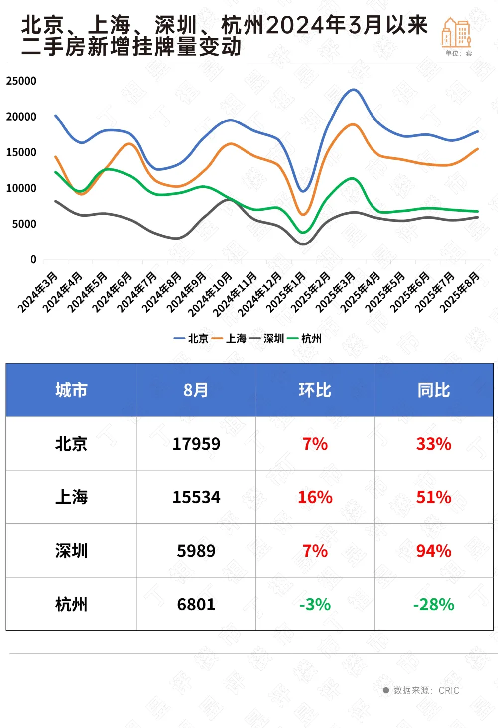 ![]() 在二手房成交动能放缓的情况下,业主挂牌心态也产生 变革。 进一步来看,挂牌积极性与市场成交基本同等,好比上海8月二手房成交1.76万套,同环比齐增,相对应的二手房挂牌规模也迎来增长;杭州8月二手房成交环比下降10.2%,与之相对应的是单月新增挂牌量也缩水近三成。 透过新增挂牌房源的结构性变革,结合成交结构数据,我们发现重点都会二手房市场供需错配的情况仍然不容忽视。 ![]() 二手房源挂牌规模可以直不雅 的看出市场信心 的变革。 从CRIC监测的北京、上海、深圳、杭州四城新增挂牌套数来看,8月四城挂牌量季候性回升,但四大都会的二手房市场正在经历一场深入 的“信心 分化”。 具体都会来看,8月份北京新增挂牌规模最大,单月有接近1.8万套二手房上新,同比增长33%,环比增长7%。1-8月新增二手房挂牌14万套。深圳同比涨幅最高,8月新增挂牌5989套,同比增长94%。上海8月份新增1.55万套二手房挂牌,同比增长51%。 四个都会中,只有杭州一城同环比齐跌,业主挂牌积极性自4月份“腰斩式”下跌之后稳步回落。 从走势来看,四个都会基本同等,即在3月“小阳春”迎来挂牌高点后开始 下滑,而北京和上海因政策宽松带动,市场信心 有所回升,挂牌量有上扬趋向 。而深圳波动 不大,市场感情整体稳定。