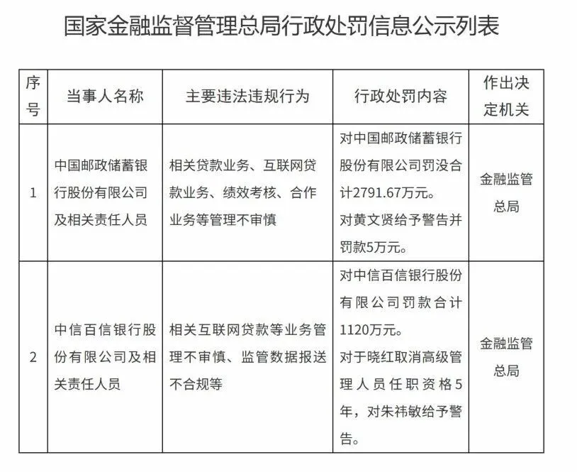 9月30日,国家金融监督办理 总局公布对邮储银行与百信银行的处罚信息。此中,邮储银行因对相干贷款业务、互联网贷款业务、绩效考核、合功课 务等办理 不审慎,被罚没合计2791.67万元;相干责任人黄文贤被给予警告并处以