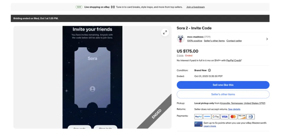 从5美元到45美元不等。 一位卖家甚至尝试以175美元的高价拍卖一枚邀请码,虽然最终流拍,但也足以窥见这场狂热的冰山一角。 Sora的邀请体系设计得极具社交流传性:每位成功注册的新用户,都邑