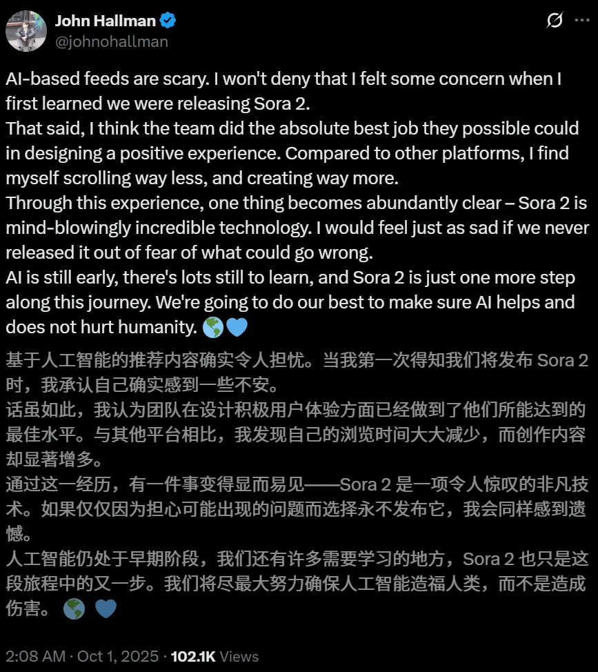 时,总会迸发出既紊乱又迷人的火花。 而真正的故事,才刚刚开始。 https://techcrunch.com/2025/10/01/openai-staff-grapples-with-the-companys-social-media-push/ https://www.businessinsider.com/sora-open-ai-invite-codes-resell-2025-10
