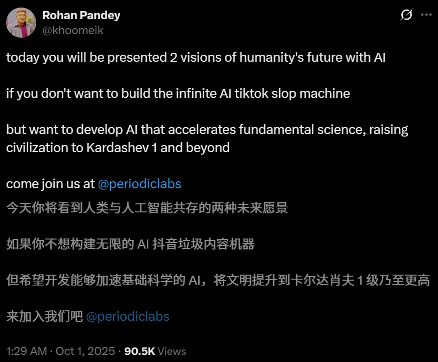 地借机为自己的新公司Periodic Labs打广告。 他犀利地发问: 如果你不想打造一台永无尽头