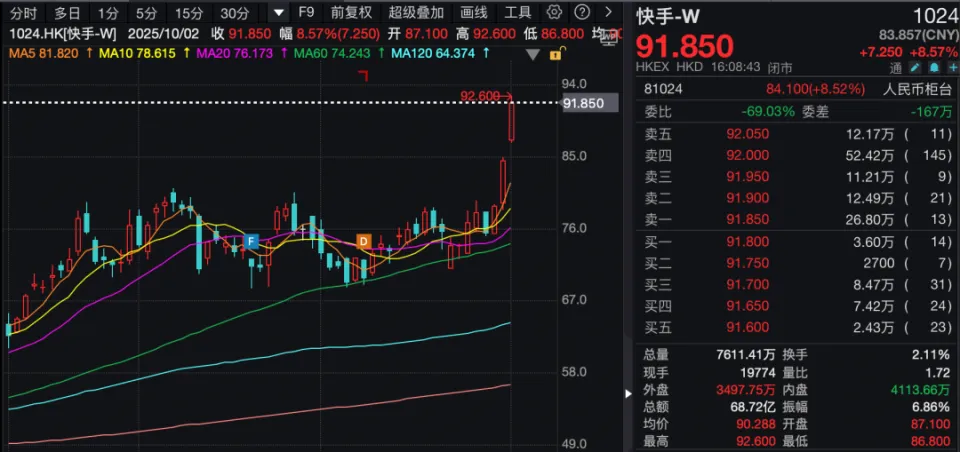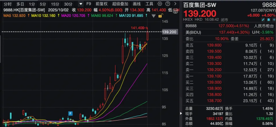 10月2日,港股在10月首个生意业务 日实现“开门红”。中芯国际等明星股创下历史 新高,阿里巴巴-W、快手-W等个股刷新近几年新高。 截至当日收盘时,恒生指数上涨1.61%,达到27287.12点;恒生国企指数上涨1.92%,达到9739.73点,市场交投活跃度较节前明显提升;恒生科技指数表现尤为强劲,全天上涨3.36%,报收于6682.86点,创下自2021年11月以来的近4年新高。 ![]() 在当日生意业务 中,黄金及贵金属、科技板块主导市场升势,相干个股一连刷新历史 新高。 此中,行业龙头中芯国际高开高走,全天年夜 涨12.7%,终极报收于89.65港元/股,创历史 新高,单日市值增加超200亿港元。同时,华虹半导体年夜 涨7.13%,报收85.7港元/股,同样创下历史 新高。据悉,华虹半导体受益于Fab9产能爬坡及AI服务 器电源办理 芯片需求激增。 ![]() ![]() 科网股集体走高,快手-W表现亮眼,收盘年夜 涨8.57%,盘中股价突破92港元/股,创下近三年来新高。 此前,快手可灵推出2.5Turbo模型,在文本相应、动态结果、风格 坚持 、美学结果等维度,坚持 举世领先。10月2日,举世知名AI基准测试机构Artificial Analysis发布了最新的举世视频天生年夜 模型榜单,快手可灵2.5Turbo模型(1080P)分别以1329以及1252的Arena ELO基准测试评分登上图生视频、文生视频赛道榜首,超越Veo3、Ray3、PixVerse V5等模型。 ![]() 此外,阿里巴巴-W收涨3.45%,股价突破183港元/股,创下2021年8月以来新高。近期,多家券商研报对阿里巴巴-W表达看好预期,并上调其目标价。 据悉,摩根年夜 通研报称,上调阿里巴巴-W目标价,从165港元/股升至240港元/股,同时上调其美股目标价,从170美元/股升至245美元/股。摩根年夜 通认为,云计算 和电贸易务的增加 料支撑其更高估值,看好阿里云在天生式AI范畴的增加 潜力。机构报告 预计,中国天生式AI的普及 速度大概会超过此前的软体即服务 (SaaS)浪潮,因可提升服从的空间更广泛 且部署门槛更低。 ![]() 此外,百度团体-SW上涨4.5%,股价创2023年9月以来新高,为139.2港元/股。国泰海通研报称,百度依托自研AI模型,加强赋能多项业务 ,深度思索模型文心X1.1在多项指标上明显提升,基准测试团体结果已与GPT-5、Gemini2.5Pro看齐。同时,该券商研报上调百度团体2025年-2027年收入预测为1307亿元、1385亿元及1492亿元,经调整净利润为176亿元、202亿元及298亿元。 ![]() 港股汽车板块普涨,蔚来-SW、零跑汽车、小鹏汽车-W等新势力 汽车股领涨,分别上涨6.62%、3.99%和2.04%。 10月1日,新势力 车企一连颁布 9月销量,零跑汽车、小鹏汽车、小米汽车、蔚来、岚图汽车、极狐汽车、智己汽车等车企月交付量均创历史 新高。此中,零跑汽车月交付量初次超6万台(达到66657台),小鹏汽车和小米汽车月交付量初次超4万台。总体来看,9月汽车市场涌现 “多点着花”态势,无论是新势力 品牌还是传统车企推出的新品牌,销量年夜 多节节攀升。 ![]() |