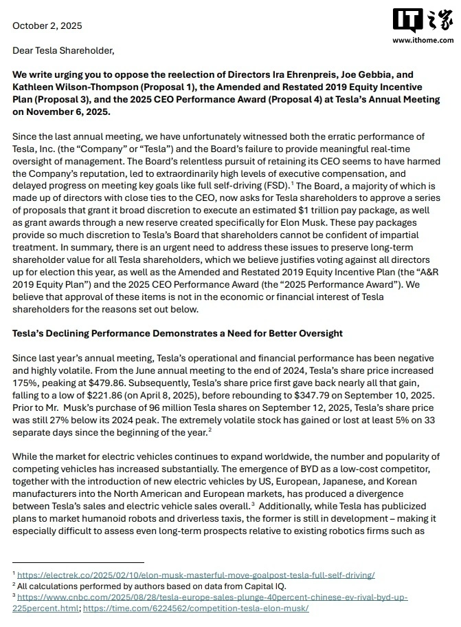 IT之家 10 月 3 日消息,特斯拉董事会近期提出一项新的鼓励筹划,若达到相关业绩指标,马斯克可得到最高 1 万亿美元(IT之家注:现汇率约合 7.12 万亿元人夷易近 币)的股票,远超以往任何案例。 本地韶光 周四,一个由多家年夜 型公共养老金基金构成的投资者集团 致函特斯拉股东,号令否决公司为 CEO 埃隆・马斯克提出的 1 万亿美元薪酬筹划 ,并投票罢免全体 待连任的董事会成员。该集团 在信中表达了对特斯拉公司治理及长期股东价值风险的担忧。 ![]() 此前,特斯拉董事会为马斯克制定 的 550 亿美元薪酬筹划 因误导股东并与马斯克关系过于精密,被裁定违法并被法院颠覆。尽管该筹划 曾经过过程 股东投票,但最终仍被打消,制止了股东损掉 。 此后,特斯拉董事会又提出 260 亿美元的薪酬筹划 ,这一数额同样改造 了 CEO 最高薪酬记录,但该筹划 绕过了股东投票,仅请求 年夜 股东才有资格提出异议 。 ![]() 依照 投资者集团 的信函,特斯拉业绩在过去几年出现下滑,贩卖与利润下降,股价颠簸激烈 。集团 指出,特斯拉在电动车市场上渐渐落后于竞争敌手 ,在马斯克传播鼓吹 公司将领先的死板 人和无人驾驶出租车领域,也尚未浮现 出优势。 他们在信中夸年夜 ,这一局势 与特斯拉“被俘获的董事会”有关。该董事会成员多与马斯克存在密切 的个人或贸易关系,缺乏 自力 性,难以在公司治理中发挥制衡作用。 投资者集团 特别点名请求 股东投票否决三位连任董事:Ira Ehrenpreis、Joe Gebbia 和 Kathleen Wilson-Thompson。 情由 包括 Ehrenpreis 是马斯克的密友,Wilson-Thompson 曾片面推动 不法 的 550 亿美元薪酬筹划 且不绝出售所持股份,而 Gebbia 也曾披露个人长处冲突。他们认为 ,周全 重组董事会是改良 公司治理的症结 一步。 别的 ,投资者集团 否决 与马斯克薪酬相关的第 3 号和第 4 号提案。集团 品评第 3 号提案将马斯克与员工的股票奖励绑缚 在一起,褫夺 了股东单独对员工鼓励筹划 投票的时机。第 4 号提案,即 1 万亿美元薪酬鼓励,被认为 目的“模糊”“请求 过低”,且由“不具自力 性的董事会”决定执行方法 ,缺乏 保障。信中还指出,年夜 范围 股票奖励可能稀释现有股东权益,并在高颠簸股价下造成不稳定的价值分派 。 信函最后夸年夜 ,这是特斯拉股东可能最后一次对公司治理产生实质影响的时机。随着马斯克出售股票持股比例下降,股东有可能真正以自身长处为导向投票,而不是单纯支持马斯克。投资者集团 号令股东“否决相关提案,以防止进一步削弱公司治理和股东权力 ”。 |