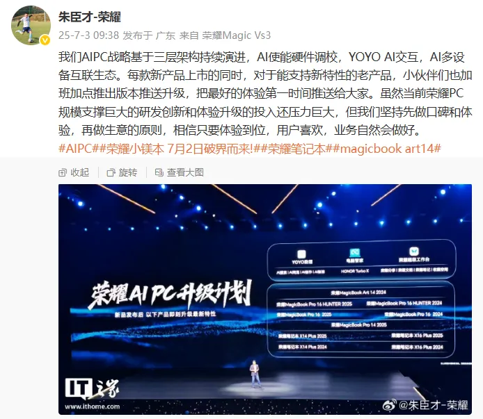 IT之家 10 月 5 日新闻 ,光彩终端股份有限公司 PC 产品总司理朱臣才本日 发文称,国庆假期光彩产品不休假,光彩西安研发中心症结 产品正在加班加点,欢迎上市。 ![]() ![]() 据朱臣才泄漏 ,光彩不仅有 10 月即将面世的旗舰平板产品,多款 26 岁首年代 上市的标记性 PC 产品也进入到攻坚克难的症结 节点。固然光彩并未颁布 待公布 的 PC 产品详细信息,但结合此前新品的推出情况来看,预计为 MagicBook Pro 系列产品(本年 2 月,光彩 MagicBook Pro 14 公布 )。 IT之家注意到,朱臣才在本年 7 月发文称,光彩的 AIPC 战略 基于三层架构连续演进,AI 使能硬件调校,YOYO AI 交互,AI 多设备 互联生态。每款新产品上市的同时,对于能支持新特性的老产品,也加班加点推出版本推送进级 。 朱臣才表现,固然当前光彩 PC 规模支持伟年夜 的研发立异 和体验进级 的投入还压力伟年夜 ,但我们坚持先做口碑和体验,再做生意的原则,相信只要体验到位,用户喜好,营业 自然会做好。 ![]() |