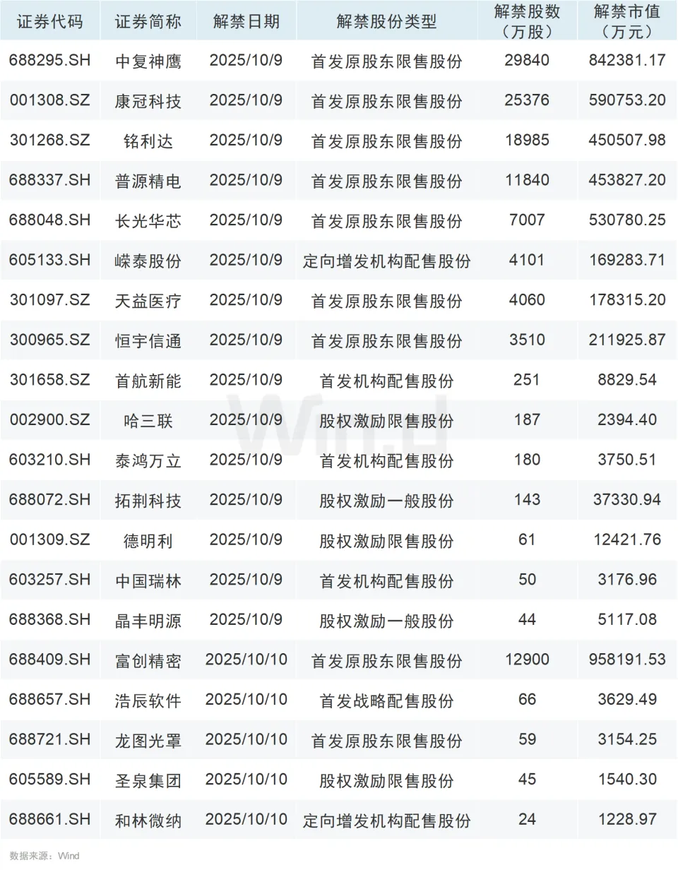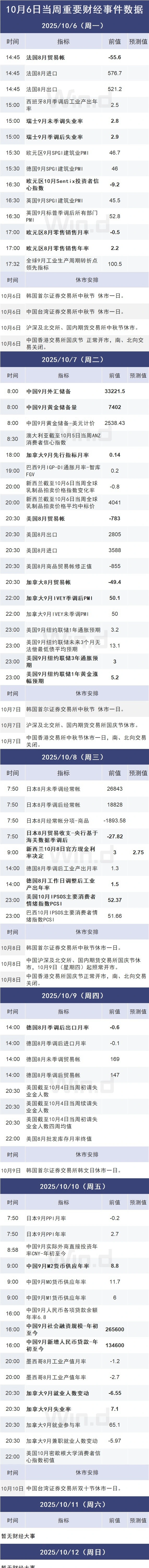 市场要闻 央行:10月9日将开展11000亿元买断式逆回购操作,限期为3个月 中国公民 银行于9月30日发布通知布告 称,坚持 银行系统 活动性富余 ,2025年10月9日,中国公民 银行将以固定数目、利率招标、多重价位中标方法 开展11000亿元买断式逆回购操作,限期为3个月(91天)。 沪深交易所:合格境外投资者可到场ETF期权交易,交易目标限于套期保值 上交所、深交所于9月30日别离 发布通知 表示,合格境外投资者可以到场在沪深交易所上市的交易型开放式指数基金期权(ETF期权)交易,交易目标限于套期保值。 合格境外投资者可以申请现货多头套期保值、现货空头套期保值持仓限额。合格境外投资者应该 经由过程 委托的期权经营机构向沪深交易所报备筹划利用的A股证券账户,报备经由过程 后再开立对应的衍生品合约账户作为套期保值专用账户。合格境外投资者应该 经由过程 委托的期权经营机构向沪深交易所提交相干期权品种的套期保值额度申请。经沪深交易所核定额度后,方可到场套期保值交易,并应该 持续相符 沪深交易所关于股票期权套期保值交易的要求。 上交所自上述通知 发布之日起开端 受理合格境外投资者到场股票期权交易的业务办理申请,深交所自2025年10月9日起开端 受理合格境外投资者到场股票期权交易的业务办理申请。 美联储钱币政策集会纪要 北京时光 10月9日凌晨,美联储将公布钱币政策集会纪要,这份文件将显现美联储内部对钱币政策的批评辩论 细节,是判定后续利率调解方向的关键按照 。 别的,美联储主席鲍威尔同日将在美联储理事会主理的一场社区银行集会上做开场发言,市场将重点关注 鲍威尔会如何批评近期的政府“关门”事件。 本周重磅数据麋集来袭 周一(10月6日):欧元区10月Sentix投资者信心指数;周二(10月7日):德国8月工业订单、英国9月Halifax房价、加拿年夜 8月贸易数据;周三(10月8日):日本8月常常账户、新西兰联储利率决议、德国8月工业产出、瑞典9月CPI初值;周四(10月9日):美国当周初请失业金人数;周五(10月10日):瑞典8月GDP、挪威9月CPI、加拿年夜 9月就业与美国密歇根年夜 学10月消耗 者信心初值。 板块事项 人工智能 OpenAI第三届年度开发者年夜 会定于10月6日在旧金山举行。年夜 会聚焦AI技能在硬件范畴的运用 拓展,或提振消耗 电子产业链,经由过程 深度整合硬件制作 与AI技能,开启了"端侧智能"的新时代。 机器人 马斯克的机器人项目传来最新进展。据最新消息,特斯拉CEO埃隆·马斯克在交际平台X发布了一段“擎天柱”(Optimus)人形机器人学习中国工夫 的视频,“擎天柱”可以大概精准应对每个招式并举行回击 。马斯克特殊强调,“这是AI,而非遥控操作”。 马斯不日 前表示,特斯拉正积极扩展 “擎天柱”的范围 化生产。在他看来,这款产品将成为特斯拉旗下最紧张的产品。 海南自贸港 天下自由区组织年夜 会将于10月10-12日在海口举行。据介绍,海南省将全面 叙述封关运作后的政策优势 ,包括“零关税”清单扩容、跨境数据活动试点等,并推出《海南自贸港自由区建立白皮书》。年夜 会时代 ,海南国际经济发展局将与迪拜、新加坡等自由区签署互助备忘录,推动贸易便利化和投资自由化。 个股年夜 事 小米集团:10月5日,小米正式官宣小米17 16+1TB版本正式开售,售价5299元。小米负责人卢伟冰表示,小米17全系列销量比往代同期显著增加 凌驾20%,Pro系列年夜 幅逾越 预期。小米17系列于9月27日正式开售,开售5分钟即冲破2025年国产手机首销日全天销量销额记录。10月2日,小米总裁卢伟冰宣布小米17系列总销量已破百万。 鸿海:9月销售额8370.7亿新台币,同比增加 14.19%;第三季度营收20574亿新台币,同比增加 10.99%;估计 第四季 度人工智能服务 器出货量持续攀升,公司业务将坚持 环比季度增加 。 限售股解禁 Wind数据统计显示,本周(10月6日至10月10日)共有20家公司限售股连续解禁,合计解禁11.87亿股,按9月30日收盘价计算,解禁总市值为446.85亿元。 从解禁市值来看,10月9日是解禁岑岭 期,15家公司解禁市值合计350.08亿元,占本周解禁范围 的78.34%。按9月30日收盘价计算,解禁市值居前三位的是:富创精密(95.82亿元)、中复神鹰(84.24亿元)、康冠科技(59.08亿元)。从个股的解禁量看,解禁股数居前三位的是:中复神鹰(2.98亿股)、康冠科技(2.54亿股)、铭利达(1.90亿股)。 从解禁股份范例来看,首发原股东限售股份有9家,首发机构配售股份有3家,股权激励限售股份有3家,定向增发机构配售股份有2家,股权激励一般 股份有2家,首发战略配售股份有1家。 ![]() 新股日历 本周(10月6日至10月10日)暂无新股申购刊行 。 ![]() 机构看后市 浙商证券:基本面稳中有进 9月经济维持弱修复态势,经济增加 动能高点或已过去,内活泼 能修复节拍 相对平坦 化,估计 三季度GDP实际增速有望达到4.8%摆布 。我们判定,后期经济基本面的不确定性或有所增加 ,特殊是外贸修复的斜率与可持续性。综合来看,经济运行在表里部环境不确定性抬升的进程 中或呈现非线性颠簸的特征,供应 和需求大概呈现K型分化走势。考虑前期逆周期政策将渐次落地形成对基本面的托底作用,估计 后续经济或渐次放缓。 年夜 类资产方面,我们以为下半年市场或呈现股债双牛结构。一方面,估计 中美经贸关系大概在震荡曲折 中走向缓和,另一方面“类平准”基金兜底尾部风险,二者均将支撑市场
