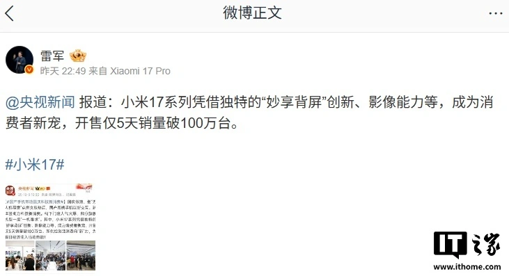 IT之家 10 月 6 日消息,央视新闻昨日报道,小米 17 系列手机开售仅 5 天销量破 100 万台,雷军本人进行了转发确认。据IT之家昨日报道,小米团体合伙人、总裁,手机部总裁,小米品牌总司理 @卢伟冰 在微博发文披露,