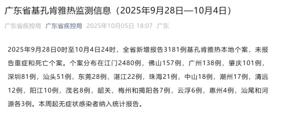 据广东省疾控局10月5日通报,2025年9月28日0时至10月4日24时,广东全省新增报告 3181例基孔肯雅热本地个案,其中 个案散布 在江门2480例。疫情重头仍在江门市,相较此前一周(9月14日至9月20日)的3153例,可见疫情快速