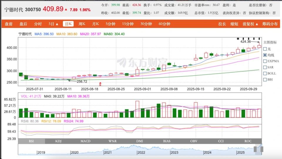 每经记者:黄辛旭 每经编辑 :余婷婷10月9日收盘,宁德时代(300750.SZ)股价报收409.89元/股,涨幅1.96%。 值得存眷 的是,宁德时代A股总市值盘中再超贵州茅台。10月9日收盘,宁德时代总市值达1.87万亿元,而
