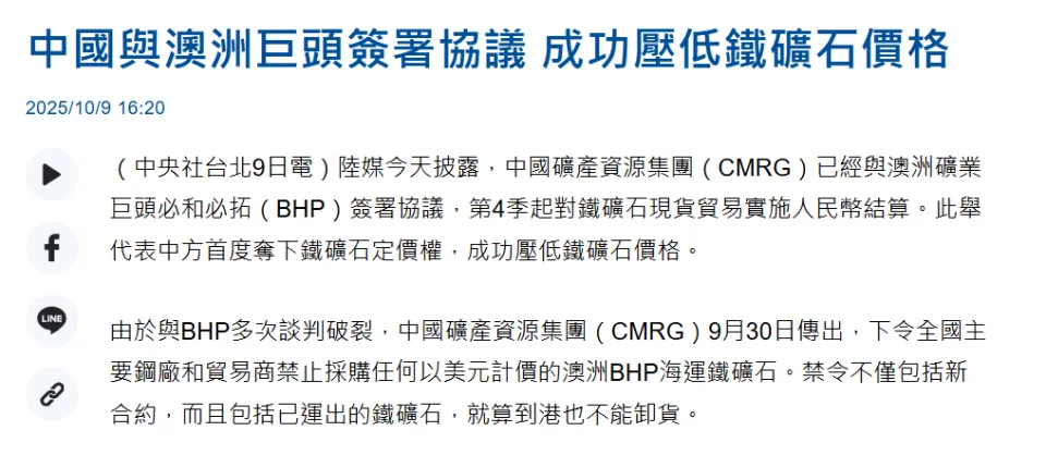 10月9日,据多家媒体报道,中国成功拿下环球铁矿石定价权,并鞭策 以人平易近 币结算,这一冲破 不光震动了国际贸易市场,也为人平易近 币国际化迈出了紧张一步。 变乱的因由源于中国哀求 澳年夜 利亚铁矿石以人平易近 币结算,遭到拒绝结武断 暂停 入口,最终 迫使澳年夜 利亚矿业巨子 必和必拓让步 。 中国的这一举措背后蕴含着深远的经济战略 和环球格局的变化。 铁矿石是环球贸易量排名靠前的年夜 宗商品,中国恒久以来都是最年夜 的入口国。 只管中国对澳年夜 利亚铁矿石的需求巨年夜 ,却一直在定价权上处于弱势,需接受普式定价机制和美元结算。 这让中国每年多付出了年夜 量额外本钱。 据报道,必和必拓的铁矿石本钱仅为19美元每吨,但其长协商定 价值 高达109.5美元每吨,而现货价值 仅为82美元每吨。 价值 虚高的现象恒久存在,紧张缘故原由是中国钢铁企业各自为战,缺乏统一的谈判机制。 为冲破这一僵局,中国在2022年创建了矿产资本 集团,整合国内四年夜 钢铁和矿产企业,形成统一对外谈判口径。 此次暂停 入口后,必和必拓仅坚持了一周便让步 ,同意以人平易近 币结算。 这不光改变了铁矿石贸易的定价规矩 ,也彰显了中国在环球资本 领域的话语权。 人平易近 币结算的运用 意义深远。 铁矿石作为环球贸易的紧张商品,其人平易近 币结算有望鞭策 铜、铝等金属及农产品贸易渐渐构建“美元+人平易近 币+欧元”的多币种结算体系 。 这一趋向 已经在其他领域显现,比方俄罗斯石油贸易商哀求 印度利用人平易近 币结算,印度国企也完成了相关交易。俄罗斯甚至将人平易近 币纳入外汇贮备 体系 ,视其为“最具稳定性的非西方货币”。 比拟 美元结算,人平易近 币付出可以大概 降低2%到3%的汇兑本钱,同时中国市场的强年夜 吸纳能力使人平易近 币成为贸易闭环中的焦点货币。 ![]() 人平易近 币国际化的背后,是中国金融战略 的全面 布局。 据央行数据显示,中国已一连11个月增持黄金,并在今年7月再次减持了283亿美元的美债。 这一系列动作表白 ,中国正在经由过程 黄金贮备 的增加 和美债的减持,减弱美元的主导地位,为人平易近 币的国际化提供稳定支撑 。 黄金作为硬通货,是抵抗美元风险的紧张工具,而美债减持则释放 了去美元化的旌旗灯号 。 这种双管齐下的策略,不光增强了中国经济的韧性,也为人平易近 币在国际贸易中的地位提升奠基了底子。 此次铁矿石定价权和人平易近 币结算权的冲破 ,反映了环球贸易格局的深入 变化。 美元、人平易近 币、欧元的多币种结算体系 正在渐渐成形,而中国的综合气力和金融布局正在改变传统的经济秩序。 |