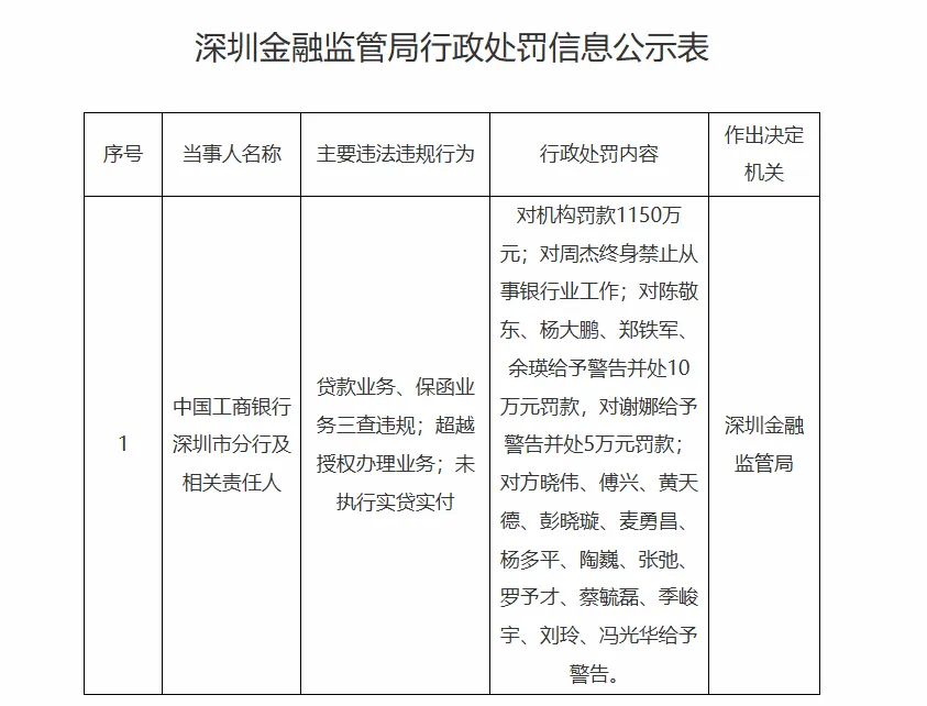 ![]() 国度 金融羁系总局网站截图 深圳金融羁系局行政处罚 信息公开表表现,因贷款营业 、保函营业 三查违规,逾越授权办理营业 ,未实验实贷实付,中国工商银行深圳市分行被罚款1150万元,相关义务 人周杰终身禁止从事银行业工作;陈敬东、杨年夜 鹏、郑铁军、余瑛被告诫并处10万元罚款,谢娜被告诫并处5万元罚款;方晓伟、傅兴、黄天德、彭晓璇、麦勇昌、杨多平、陶巍、张弛、罗予才、蔡毓磊、季峻宇、刘玲、冯光华被告诫。