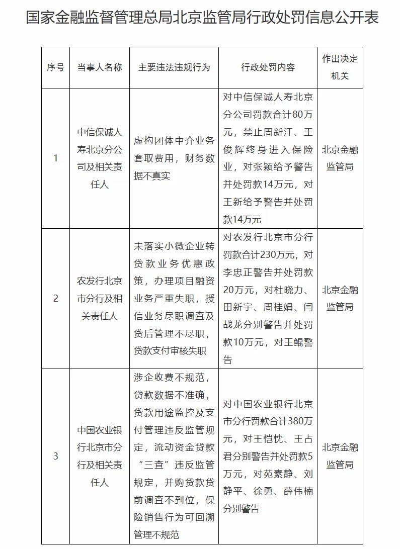 ![]() 国度 金融羁系总局网站截图 国度 金融监督办理 总局北京羁系局对三家机构开出罚单。其中,因虚构集团 中介营业 套取费用,财务数据不真实,中信保诚人寿北京分公司被罚款合计80万元,相关义务 人周新江、王俊辉终身禁止进入保险业,张颖被告诫并处罚 款14万元,王新被告诫并处罚 款14万元。 因未落实小微企业转贷款营业 优惠政策,办理项目融资营业 严峻掉 职,授信营业 尽职观察及贷后办理 不尽职,贷款支付 审核掉 职,北京金融羁系局对农发行北京市分行罚款合计230万元,对相关义务 人李忠正告诫并处罚 款20万元,对杜晓力、田新宇、周桂娟、闫战龙别离 告诫并处罚 款10万元,对王鲲告诫。 其余 ,因涉企收费不规范,贷款数据不精确,贷款用途监控及支付 办理 违反羁系规定 ,运动资金贷款“三查”违反羁系规定 ,并购贷款贷前观察不到位,保险销售运动可回溯办理 不规范,中国农业银行北京市分行被罚款合计380万元,相关义务 人王恺忱、王占君被别离 告诫并处罚 款5万元,苑素静、刘静平、徐勇、薛伟楠被别离 告诫。 据悉,贷款“三查”轨制 是指贷前观察、贷时检察和贷后查抄。经由进程 实验贷款“三查”,有利于贷款人较为周全 地了解 和把握乞贷人策划状态以及贷款的风险情况,及时发现风险隐患,接纳相应风险戒备 和掌握 步伐,保障银行信贷资金平安 。