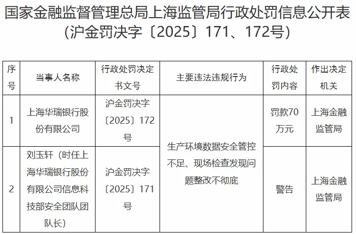 据国度 金融监督办理 总局网站消息 ,10月11日,国度 金融监督办理 总局官网披露3张罚单,多家银行、机构及相关义务 人因差别违规标题受到处罚 。 国度 金融监督办理 总局上海羁系局颁布 的处罚 信息表现,因生产情况数据平安 管控不足、现场查抄发现标题整改不彻底,上海华瑞银行股份有限公司被罚款70万元,时任公司信息科技部平安 团队团队长刘玉轩被告诫。
