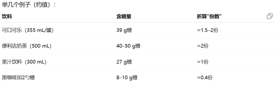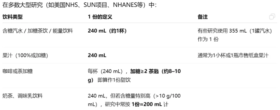 ,1 份甜饮料 ≈ 含游离糖 20–25 g(约5–6 茶匙)。2024年,一项对于英国生物样本库18万人(39-72岁)的12年追踪研讨