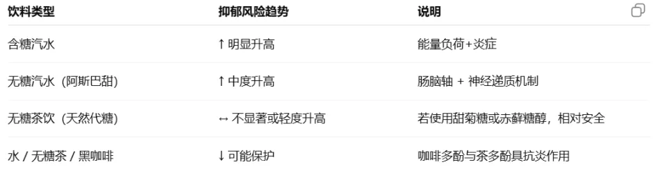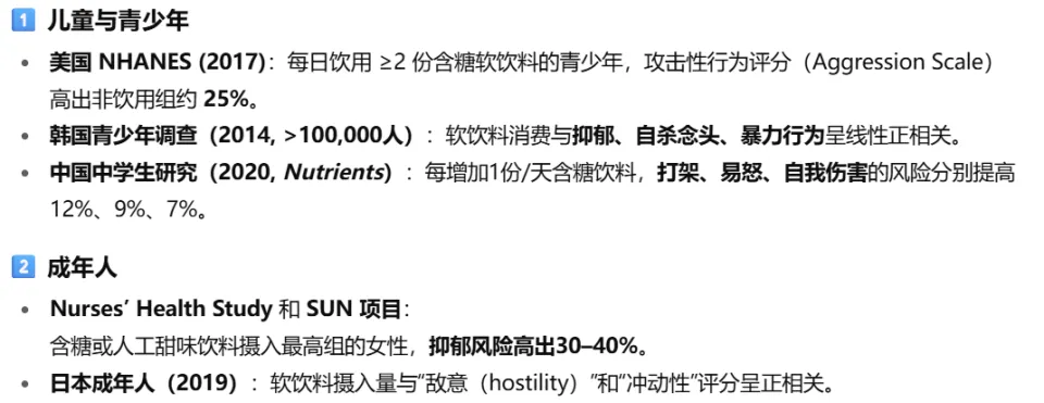 :- 每日饮用 ≥1份 杯含糖饮料者的抑郁风险进步约20–60%;