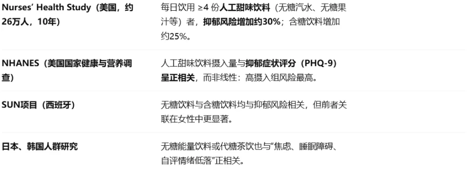 健康的100%果汁/蔬菜汁,都可能升高抑郁风险。有人可能会说,甜饮料致抑郁是不是由于热量题目,甜饮料中糖含量太高了。无糖甜饮料(用人工甜味剂代替糖)的研讨