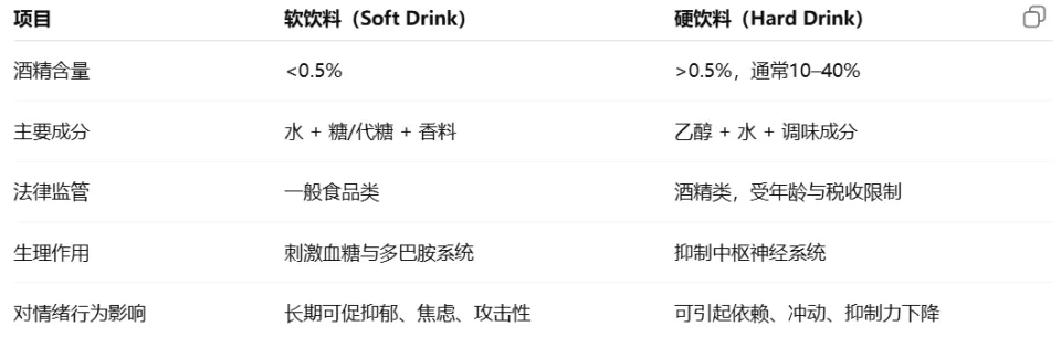 ,天天喝2份以上无糖甜饮料的人抑郁症风险升高了40%。无论有没有遗传易感性(家族有人抑郁或者检测携带了某些相干基因),无糖甜饮料都会升高抑郁风险。【2】不绝增长的流行病学证据打破了【无糖饮料=安全】的神话。抑郁症风险与无糖甜饮料摄入量呈剂量依赖关系(喝得越多,风险越高),特别是阿斯巴甜甜饮料最受诟病。软饮料(soft drink)指**不含酒精(或酒精含量极低 <0.5%)**的饮品,通常带有甜味、香味或气泡。核心特征:非酒精饮品;多数含糖或人工甜味剂;可能含咖啡因、香料、酸味剂等添加物。许多人好奇怎么没见过硬饮料,实际上硬饮料就是我们寻常所说的酒精饮料(alcoholic beverages),“Hard” 的意思就是 “含酒精”。“Hard cider” = 含酒精的苹果酒 “Hard seltzer” = 含酒精的气泡水 “Soft cider” = 非酒精苹果汁饮料 不过本期重点是软饮料,酒精饮料的影响详见其他内容比如酒的科学11:有人的身段居然会主动酿酒!彻底实现喝酒