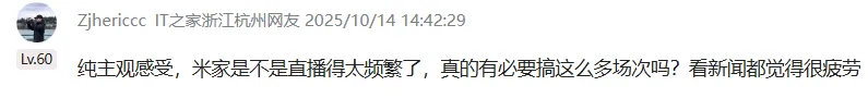好家伙,卢伟冰的直播,又双叒支配 上了。 10月14日,小米集团总裁卢伟冰公布因小米17系列销量火爆,将于15日开启返场直播,同步开放评论区征集标题。 ![]() 图源:微博 这条看似通例的动态,却敏捷引发 网友争议。评论区里,有粉丝朴拙提问想获取产品 信息。但评论区外,更多声音直指 “直播频率太密”。 新机发布,开播;首销报喜,开播;现在卖了一阵子,再来个返场直播...... 小雷根据网友们的见解来剖析 一波。先不说别的,单看卢伟冰选的这个时光 点,vivo在13号有发布会,OPPO在16号也有发布会。小米卡在14号上预告、15号做直播,恰好处在中心的空档。 ![]() 图源:IT之家 贸易竞争,抢话题、争曝光本无可厚非。你发你的新品,我讲我的销量,媒体报道一转,短视频再统统片分发,只要话题度起来,不管是夸是骂,都邑 赢了流量。 不外网友显然不买账。有不少人吐槽:“有这工夫 不如好好做系统 优化”、“卖得好直接卖就行了,不必要聊。再聊就是卖得不好”。这些直白的吐槽,恰好反应 出用户对小米高频直播的疲惫感。 那么标题来了:直播真有那么必要 吗?卖得好,直接卖不就完了?这是评论区许多人的心声。 ![]() ![]() 图源:IT之家 说真话,小雷是能明白的。假如直播里有用信息密度低,反复 环绕 销量造势,就很轻易让旁观者发生 “怎么总是你”的觉得 ,乃至效果适得其反。可现实是,只要你存眷 手机数码,平台就会自动推送相关内容,你点进来、加入评论辩论 ,小米的流量目标就达到 了,就像大年夜 家此刻点开这篇文章一样。 说起来也很有意思,小米好像生成 就带着一种“招黑”体质,做什么都轻易成为话题的核心。就拿此次 来说,直播预告下面,很快就有人扯到别的事儿上:“车刚出了舆情,选这个时光 点,是不是故意的?”你看,不管有没有直接联系关系 ,账总能算到你头上。 ![]() 图源:IT之家 不外,情感 归情感 ,事实是事实。小米17系列此次 销量确切 能打:9月27日首销,5分钟改革 本年国产手机全价位段首销记载;10月2日,销量冲破 100万台;10月5日,全系同比增长超20%,Pro版体现远超预期。 宣扬 的数据确切 亮眼,但也有概念 以为:终极还是要靠尺度版走量,Pro卖得好只是初期热度,尺度版起不来,总销量还是会吃力。 ![]() 图源:IT之家 为啥?因为厂商们推出的Pro系列往往代表着品牌形象和当代旗舰的技术上限,能吸引首批核心用户和数码喜欢 者。但真正决定 市场基本盘的,往往是价格更亲夷易近 的尺度版。假如尺度版起不来,对整体销量会发生 明显 拖累。 以是小雷猜测,卢伟冰此次 返场直播,除了维持热度,或许也有意再推一把尺度版——亲身下场答疑,夺取那些仍在观望中的用户。 说到底,小雷以为,愿意 与用户沟通是好事,但高频次的直播和擦边式的营销,长期来看,也大概徐徐消耗消耗者的耐烦。用户愿意 为小米手机买单,是认可小米的产品 力,而不是直播次数。唯有持续提供过硬的体验,才气真正留住用户。 现在,卢伟冰仍在征集直播标题。大年夜 家觉得明晚这场直播,卢总到底能聊出点啥?评论区聊聊~ |