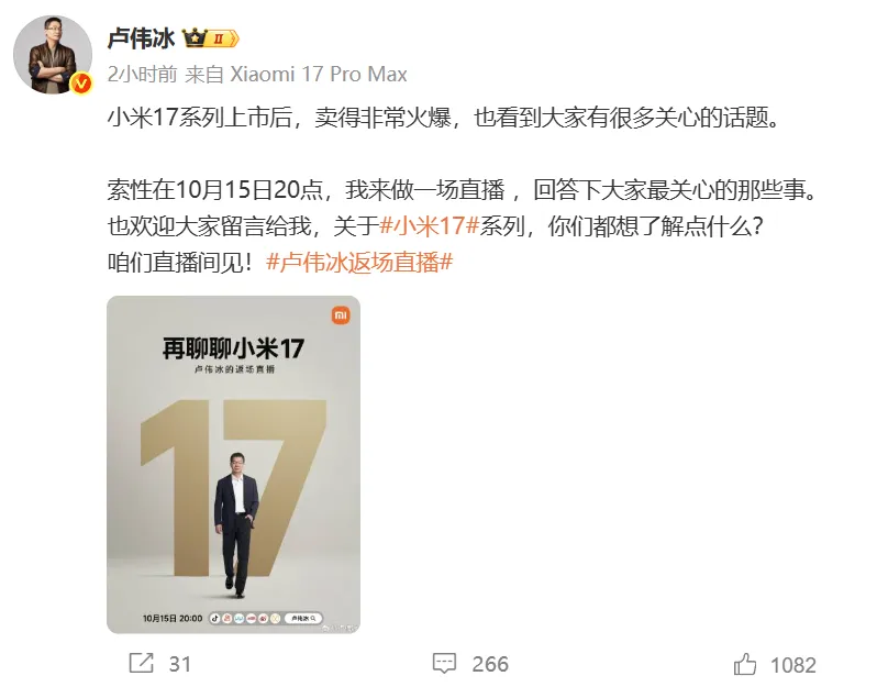 好家伙,卢伟冰的直播,又双叒支配 上了。10月14日,小米集团总裁卢伟冰公布因小米17系列销量火爆,将于15日开启返场直播,同步开放评论区征集标题。图源:微博这条看似通例的动态,却敏捷引发 网友争议。评论区里,有