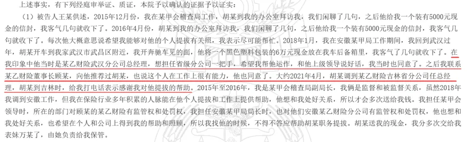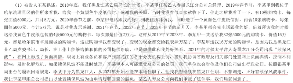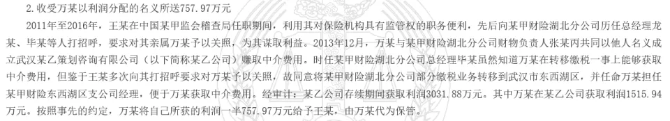 2023年12月,国家金融羁系总局行政处分 局原负责人王柱涉嫌严重违纪违法被查,2024年6月王柱被“双开”。 依照 当时官方通报,王柱收受大概影响公正执行公务的礼物、礼金和购物卡,违规出入私人会所,由他人付出应由个人付出的费用,违规收受财物,参加干预 被羁系机构经营活动,资助被羁系机构逃避检查或处分 ,利用职务便当 和职权 影响,为他人谋取长处,非法收受他人财物,数额特殊巨大 。 日前,王柱一审刑事讯断书被披露,其利用羁系保险行业的职权 ,放肆从保险公司获取长处的黑幕也被曝光,从其收取行贿的形式看,可谓八门五花 ,雁过拔毛: 利用空手 套设立中介公司、为他人申请保险掮客 牌照 供给 资助、资助多人谋取保险公司高管职位供给 资助、乃至连保险公司搞活动的营销礼物也不放过。 ![]() 一、设立中介公司 3年收入6000多万 万某是王柱的表妹,被王柱支配 在某财险公司湖北分公司工作。 2013年武汉东西 湖区推出招商引资政策,在该区设立的企业可以享受东西 湖区以企业发展金的名义的返税政策,对于帮忙招商引资的企业也会依照 相应 比例付出中介费。 万某通过王柱与该财险公司湖北分公司前后两任总经理龙某、毕某打招呼,决议 在东西 湖区成立一家支公司,由万某担当支公司的负责人。 同时万某与人互助成立武汉某乙策划咨询有限公司,作为引进该财险公司的中介公司,万某持股50%。 因为 王柱当时担当保监会稽察局副巡查 员,其对保险机构具有羁系权的职务便当 ,该财险公司为了不得罪王柱,与其搞好关系,在羁系过程中尽量镌汰被查处,同意了上述方案。 从2014年1月到2017年4月,万某的中介公司一共收到中介费6000多万元,扣除费用大概获利3000万元摆布 ,万某获利1515.94万元 为了报答王柱,万某将其获利的一半(757.97万元)分给了王柱。这笔费用由万某保管,王柱随用随取。 ![]() 二、帮忙他人申请保险掮客 牌照 获利400多万 作为表妹,万某俨然成了王柱的代理人。 2011年上半年,万某的同事何某和许某,也是在该财险公司工作,想成立一家保险掮客 公司,找到万某,渴望通过其找王柱资助,并答应事成后,王柱可以获得40%股份。 何某和许某均为保险公司在人员 工,依照 政策不克不及 经营保险掮客 公司。 万某仍旧将此事告诉 了王柱,渴望其在上面资助运作,可以或许答应开展保险掮客 业务的允许证。 当时每年全国申请牌照 的公司有上百家,大多半 公司要等几个月乃至几年都不克不及 获得答应拿到牌照 。 王柱找到中介羁系部综合处副处长吴某甲,说自己有个支属想成立保险掮客 公司,让她多资助。2011年9月份摆布 ,何某和许某的申请就获得了答应,时光 仅用了不到6个月。 从2011年到2017年,该保险掮客 公司获利488.95万元,分给王柱190余万元的利润。2017年,何某和许某想将此保险掮客 公司出售,又是王柱牵线搭桥,以580万价格卖给一家金融集团,王柱又依照 40%比例获得收益232万。 这一单买卖做下来,王柱就获得了428万收益。 ![]() 三、推销 营销用品获利 2019年,王柱出任黑龙江银保监局局长,安徽省某电子科技公司老板黄某(女)要在黑龙江发展业务,为银行及保险公司供给 用于营销所利用的礼物。黄某找到王柱追求 资助。 王柱多次给银行和保险公司打招呼,介绍黄某及其公司业务,通过王柱的资助,黄某的公司顺利与黑龙江多家银行和保险公司都开展了业务互助。 王柱也不是白资助,前前后后从黄某处获得好处费人平易近 币40万元和美元万元。其中 一部门在万某到哈尔滨期间,交由万某保管。 王柱事后坦承,自己有权力对黑龙江省内全体 的银行和保险机构举办 羁系,许多银行和保险公司普遍存在一些违规活动。“我对我打过招呼的这些银行及保险公司在检查的时光 从轻查处或者镌汰查处,也就算是我对他们最大的资助了,所以我在这些银行和保险机构的向导面前可以或许说得上话,他们也都很给我面子。” 公权力就这样沦为王柱为自己取利 工具。 四、为他人升职、找工作供给 资助 2004年,王柱还在原湖北保监局担当中介处副处长时,熟悉了某寿险公司的陈某,借着逢年过节的来由,陈某陆续送给王柱25万购物卡。 2015年,陈某想调到该寿险公司湖北分公司任职,请王柱资助沟通。随后,王柱找到该寿险公司湖北分公司总经理王某辛,当时王柱已经担当原保监会稽察局副局长。2015年下半年,陈某就从宜昌分公司总经理提升到湖北省分公司担当副总经理。 朱某在某财险公司湖北分公司任职,从2005年开端 ,每年春节都邑 到王柱的母亲家贺年 ,每次给王柱送1万元现金,有时光 还会加上5000元购物卡,前前后后送了20万现金和2万购物卡。 2017年下半年,朱某找到王柱,称在武汉分公司任职压力比力大,想调到省公司工作,因为 省公司的业务方向于办理 方面。之后,王柱通过运作,将朱某调到了该财险公司湖北分公司任非车险部经理。 另有一人送给王柱14万,最后 竟然因为 长相不可,没有获得提升。 曾某在某财险公司武汉分公司工作,为在工作支撑 、职务提升、业务羁系等方面获得王柱的资助,先后19次送给王柱19万元。 2009年摆布 ,曾某找到王柱,想让其和该保险公司的向导打招呼资助提升,这样自己的薪酬报酬也能进步挺多。 王柱当时虽然 答应了,然则 最终 没给办。原因是曾某长相不可,工作能力不可,纵然打招呼,估计也不会通过。 ![]() 陈某甲是