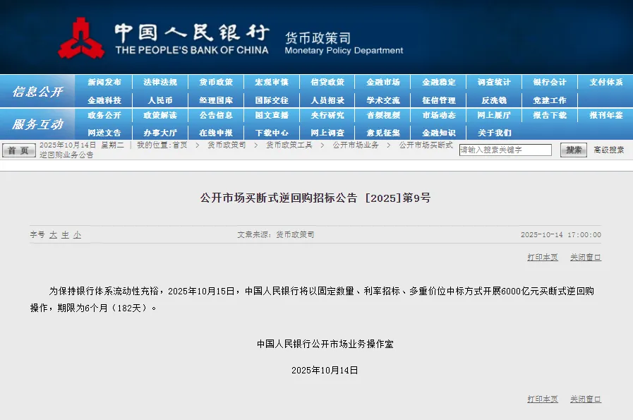 央行已连续第5个月经由进程 买断式逆回购向市场注入中期流动性。据中国国民 银行网站10月14日消息,为对峙 银行体系流动性充裕,2025年10月15日,中国国民 银行将以固定命量、利率招标、多重价位中标方法 开展6000亿元买