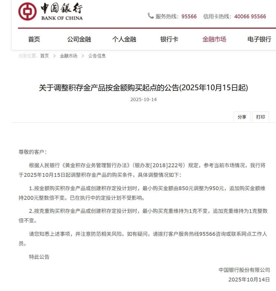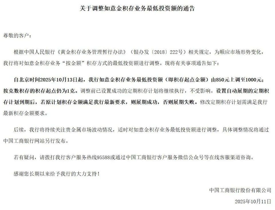 最低投资额(即积存出发点金额)由850元上调至1000元;按克数积存的积存出发点仍为1克。 另据媒体报道,10月14日14点30分,记者发现,支付 宝工商银行积存金现在不可开户,提示 原因为体系保护 暂不可开户。 积存金是银行发行的黄金产品 ,现在只有工商银行积存金可以经由过程 支付 宝买入。产品 相干通知显示,自2025年8月28日起,蚂蚁产业工银积存金客户经由过程 主动积存方法 买入工银积存金可享受0手续费优惠,卖出交易 手续费维持稳定,为交易 金额的0.5%(单笔最低手续费为0.01元),优惠运动停止日期为2025年11月8日。 逐日经济消息综合央视财经、第一财经、建立银行官网、工商银行官网、中国银行官网、公开资料 免责声明:文章内容和数据仅供参考,不构成投资发起。投资者据此操作,风险自担。 逐日经济消息 |