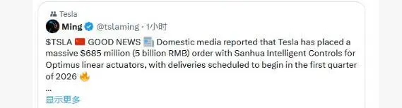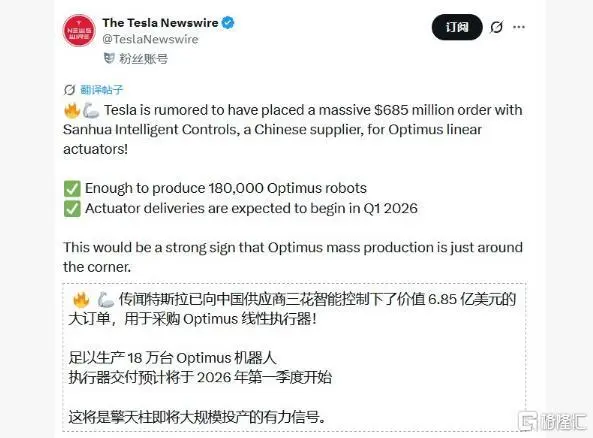 受政策提振以及特斯拉传闻刺激,呆板人概念卷土重来。 周三,港A呆板人板块集体飙高。截至A股收盘,金盘科技、美力科技20CM涨停,百利科技、兴森科技、香山股份等十余股涨停。 港股微创呆板人大年夜 涨超8%,极智嘉-W、华虹半导体涨超5%,德昌电机控股涨、优必选超4%,首程控股等涨超3%。 ![]() ![]() 天价订单传闻呆板人板块发力之际,本日市场最靓的仔:三花智控AH股午后猛飙! A股收盘涨停报44.18元,总市值1859.5亿元;H股现升逾12%报39.38港元,总市值1657.48亿港元。 ![]() 据市场传闻,特斯拉已向中国供应商三花智控下达6.85亿美元(约50亿元)大年夜 额订单,焦点采购其线性关节产品。 该部件作为Optimus人形呆板人实现精准屈伸运动的“症结 关节”,将直接用于特斯拉这款呆板人的范围 化量产筹划。估计 交付将从2026年第一季度开端 。 ![]() ![]() 在此传闻刺激下,三花智控股价立刻应声高走。 随后三花智控方面回应体现,公司已经留意到该传闻,公司内部正在告急核实,若消息 不实将通过官方渠道辟谣。 同时确认,公司与特斯拉当前互助进展顺遂,但详细细节因保密协议暂无法披露。 值得一提的是,特斯拉天价订单传闻已不是第一次传出。 早在今年 9月份的时光 ,市场就曾传三花智控斩获了其大年夜 额订单。 据悉,三花智控深度绑定特斯拉,是其人形呆板人执行器总成的主力供应商。 此前,特斯拉官宣岁尾 筹划推出第三代Optimus,并在2026年开端 量产。马斯克还估计 2030年前将年产100万台。 市场分析指出,跟着 特斯拉人形呆板人逐步从研发走向范围 化量产,三花智控的干系营业 收入有望实现快速增长。 呆板人此次呆板人再度爆发,还得益于政策技巧 双轮驱动。 近期,上海发布智能终端行动计划 。提出支撑 人形呆板人研发和量产,并明确请求 推动 "灵巧手"、"端侧芯片"、"电池"等焦点零部件的产业化突破,为产业发展供给 了清楚指引。 从国内来看,人形呆板人产业正发达发展。 此中,宇树科技将于2025Q4提交IPO申报质料 ,智元呆板人入主上纬新材,乐聚呆板人完成股改…… 平易近 生证券体现,头部国产人形主机厂的证券化进程不断加快,正在成为板块感情全新催化剂。 上海证券以为,近期国内外产业端迎来麋集催化,产业潮起入局者明显增多,国内多半 企业纷纭 加码具身智能,外洋特斯拉、Figure AI等加快贸易化量产步伐。 DeepSeek等人工智能公司的涌现推动通用呆板人大年夜 模子的发展,助力人形呆板人实现具身智能,人形呆板人产业链进入“百花齐放,百家争鸣”阶段。 现在,人形呆板人进入工业场景,已经成为国内外确定性较高的运用 趋势 ,人形呆板人贸易化落地可期。 华创证券也最新指出,Optimus一旦量产,将重塑‘呆板换人’产业格局,中国供应链具备先发上风。 |