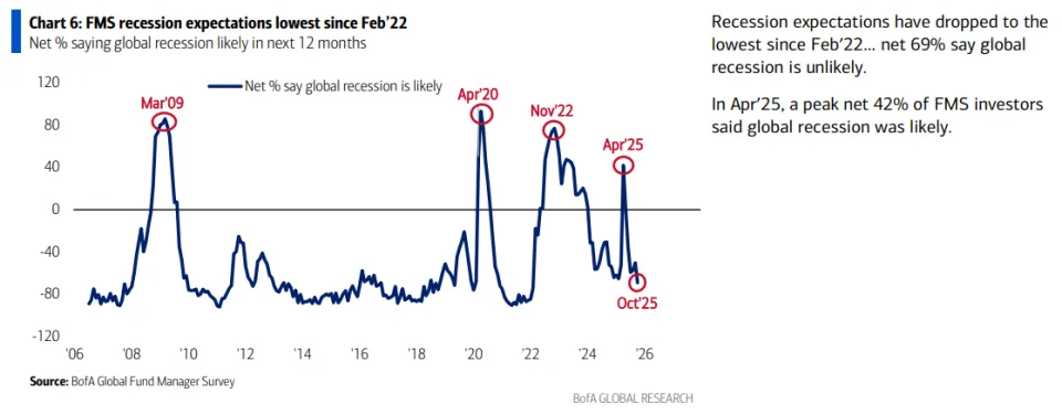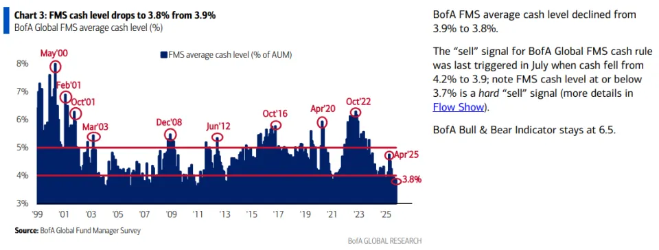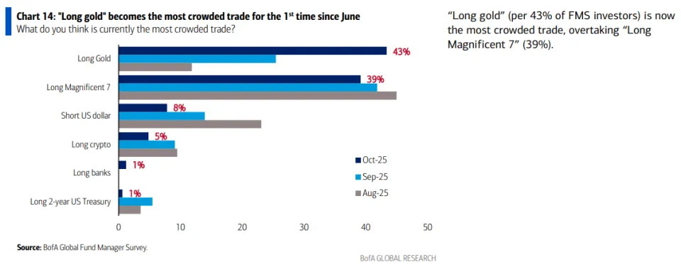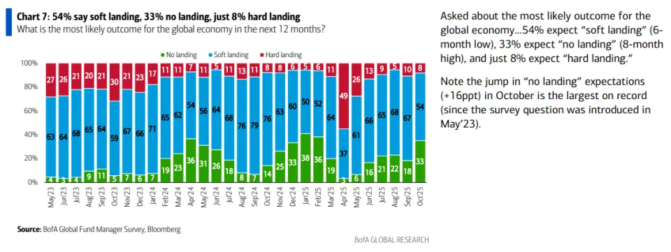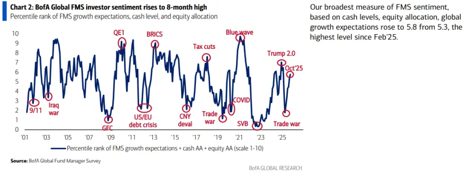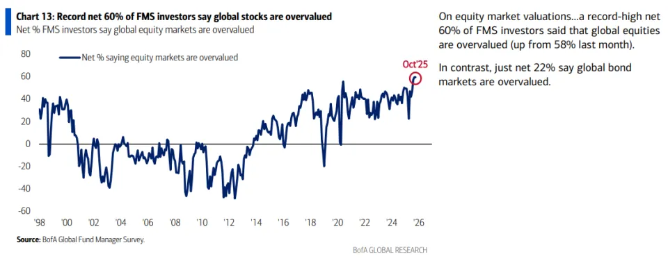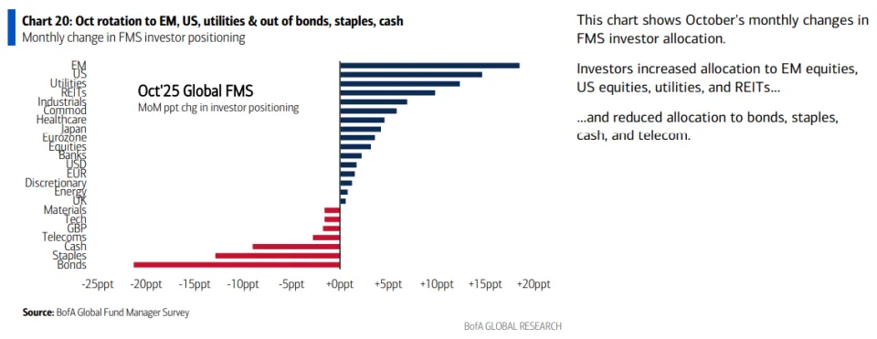 财联社10月15日讯(编辑 潇湘)美国银行最新宣布 的10月环球基金经理观察体现,环球基金经理对股市的乐不雅 感情达到了2月以来最高水平,但跟着 人工智能(AI)概念股今年 履历了持续的强劲上涨,对AI泡沫的担心也正上升至空前水平。 ![]() (投资者感情指标)本次观察于10月3日至9日进行,共收集 166位解决 着4000亿美元资产的到场者意见。 观察体现,基金经理本月的股票配置比例攀升至八个月高点,债券配置则降至2022年末以来最低水平。大量 商品和新兴市场股票的配置已飙升至多年来的最高水平。 ![]() 受访者的现金配置比例骤降至了3.8%,处于观察汗青上的“极低”水平。 ![]() 这表明 机构投资者的风险偏好激进,流动性状态被视为2021年9月以来最佳。 ![]() 基金经理们基本抛却了对经济衰退 的担心。观察体现,受访者对经济增加 乐不雅 感情出现自2020年10月以来最大的六个月升幅。 ![]() 有33%的受访投资者估计 出现“无着陆”情形(即经济增加 与通胀同时坚持 强劲),为八个月新高,9月该比例为18%。估计 “软着陆”的投资者比例降至六个月低点,仅54%,较9月的67%显着降落。估计 “硬着陆”的比例则从9月的10%降至8%。 ![]() 观察体现,受访基金经理对美国股票已转为超配,这是自2月以来的首次。 然而在看涨布局背后,估值担心正持续升温。创纪录的60%受访者认为环球股市估值过高。 ![]() 54%的受访者认为人工智能概念股已进入泡沫地区。 ![]() 在此次观察中,“AI股票泡沫”(33%)被列为最大尾部风险,超越了“第二波通胀”(27%)和“美联储落空 自力 性和美元贬值”(14%)。 ![]() 作为对比,9月份排名前三的尾部风险分别是“第二波通胀”(26%)、“美联储落空 自力 性和美元贬值”(24%)和“债券收益率无序上升”(22%)。 观察还体现,基金经理们认为“做多黄金”已成为当前市场上最拥挤的生意业务。共有43%的受访投资者将“做多黄金”列为最拥挤生意业务,高出了“做多七巨子 ”的39%。 ![]() 本月早些时候,现货黄金史上首次升破了4000美元大关。然而,从中获益的基金经理大概并不多。39%的受访者称其当前黄金头寸接近0%,19%的受访者配置约2%,16%的受访者配置约4%。按照 统计,黄金的加权平均配置比例仅为2.4%。 美银计谋师迈克尔·哈特内特在观察报告中指出:“本月前三大的尾部风险依次为:AI泡沫、第二波通胀、美联储丧失 自力 性及美元贬值。相比 之下,观察中的贸易战风险(5%)自4月峰值以来已显著缓解——当时创纪录的80%受访投资者将其视为最大尾部风险。 美银报告还提到,纵然仓位配置过高,投资者好像仍认为回报潜力值得承担风险。私家信 贷被认定为最有大概引发体系性变乱的领域 ,这表明 乐不雅 感情的外貌下已出现裂痕。 观察体现,市场风险偏好出现剧烈变化,大概在短期内延续股市和大量 商品的涨势,但黄金和人工智能等拥挤生意业务的主导职位表明 ,如果通胀或政策预期产生 变革,市场大概容易出现突然逆转。 |