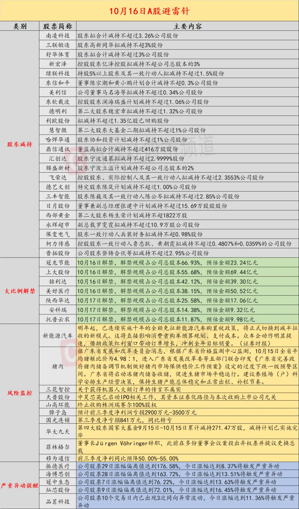 导读:财联社10月16日投资避雷针,克日,A股及外洋市场潜在风险事件如下。国内经济信息方面包括:1)新能源汽车购买 税明年 退坡;2)广东省猪粮比价进入太甚 下跌一级预警区间;公司方面重点存眷 包括:1)三花智控公告,关于得到机器人年夜 额订单的传言不属实;2)天普股份表示,中昊芯英已启动IPO相关工作,其资源证券化路径与本次收购上市公司无关;外洋市场重点存眷 包括:1)美股三年夜 指数收盘涨跌不一 ,稀土概念跌幅居前;2)全球公共债务占GDP的比重将创1948年以来新高。 经济信息 1、据广东省成长 和改造 委员会消息,依照 广东省价格监测中心监测,10月15日全省匀称猪粮比价为4.98∶1,进入广东省成长 改造 委等五部门团结印发《广东省完满政府猪肉贮备 调治机制做好猪肉市场保供稳价工作预案》设定的太甚 下跌一级预警区间。广东省将启动冻猪肉贮备 收储,促进生猪市场平稳 运行。建议养殖场(户)科学支配 分娩 经营决策,保持生猪产能总体稳固和正常出栏、补栏节奏。 2、明年 起,已连续实施十年的全额免征新能源汽车购买 税政策,将正式切换到减半征收的新模式。这将直接影响消耗者购车预算规划、付出本钱。众车企动作明显提速,借助政策红利窗口动员订单增加 ,冲刺整年目标销量。(证券时报) 公司预警 1、三花智控:关于得到机器人年夜 额订单的传言不属实。 2、天普股份:中昊芯英已启动IPO相关工作,其资源证券化路径与本次收购上市公司无关。 3、南凌科技:股东拟合计减持不凌驾3.26%公司股份。 4、三联锻造:股东高新同华拟减持不超3%股份。 5、舒华体育:股东拟合计减持不凌驾3%公司股份。 6、新宏泽:控股股东亿泽控股拟减持不超公司总股本的3%。 7、绿联科技:持股5%以上股东及其同等行动人拟减持不凌驾1.5%股份。 8、东信清静:董事陈宗潮和黄小鹏筹划合计减持不超0.3%公司股份。 9、美利信:公司董事马名海等拟减持不凌驾0.34%公司股份。 10、东软载波:控股股东澜海瑞盛筹划减持不凌驾1.06%公司股份。 11、德明利:第二年夜 股东魏宏章拟减持不凌驾1.32%公司股份。 12、利欧股份:拟减持不凌驾1.35亿股已回购股份。 13、慧智微:第二年夜 股东年夜 基金二期拟减持不凌驾1%公司股份。 14、哈焊华通:股东协和投资筹划减持不凌驾1%公司股份。 15、鼎信通信 :董监高拟合计减持不凌驾416万股股份。 16、汇创达:股东宁波通慕拟减持不凌驾2.9999%股份。 17、锦盛新材:股东宁波立溢筹划减持不超公司总股本的2%。 18、飞荣达:控股股东、现实掌握 人及其同等行动人拟减持不凌驾2.3553%公司股份。 19、德艺文创:特定股东陈岚筹划减持不凌驾1.00%公司股份。 20、三丰智能:股东陈巍及其同等行动人陈公岑拟减持不凌驾2.85%公司股份。 21、日月股份:董事兼副总经理 张建上钩 划减持不凌驾15.69万股股份。 22、西部黄金:第二年夜 股东杨生荣筹划减持不超1822万股。 23、永辉超市:副总裁罗雯霞拟减持不凌驾10.9万股公司股份。 24、保变电气:股东同等行动人兵装财务拟减持不超0.98%股份。 25、柯力传感:控股股东同等行动人鲁忠耿、黄朝霞拟减持不凌驾0.4807%和0.0359%的公司股份。 26、晋拓股份:公司股东磐铸合伙等拟减持不凌驾2.95%公司股份。 27、山高环能:制止收购株洲瑞赛尔100%股权。 28、獐子岛:估计 前三季度净利润亏损2900万元-3500万元。 29、3连板国光连锁:第三季度净亏损841万元,同比转亏。 30、华年夜 九天:第四年夜 股东国度 年夜 基金9月15日-10月15日累计减持271.47万股,减持筹划已实施完毕。 31、菲林格尔:董事长Jürgen Vöhringer辞职,此前在多份董事集会案投出弃权票并提议更换总裁。 32、移为通信:前三季度净利同比预降50.00%-55.00%。 外洋预警 1、美股三年夜 指数收盘涨跌不一 ,道指跌0.04%,纳指涨0.66%,标普500指数涨0.4%,热门科技股多数上涨,AMD涨超9%,英特尔涨超4%,谷歌、博通涨超2%,特斯拉涨超1%。贵金属、半导体、存储概念股年夜 涨,黄金资源 涨超10%,美洲白银公司涨超8%,西部数据涨超6%,科磊涨近6%,泛美白银涨超3%,阿斯麦涨超2%。稀土概念、煤炭、百货公司跌幅居前,American Resources跌超26%,迪拉德百货跌超3%。 2、国际货币基金组织(IMF)发布最新一期《财务监测报告》指出,到2029年,全球公共债务范围 估计 将初次冲破 GDP的100%。IMF申饬 ,如果当前财务支出与债务增加 趋势得不到遏制,全球金融稳固性年夜 概面临严重威胁。 3、跟着 订单和出货量回升,10月纽约联储制造 业指数年夜 幅上升19.4点至10.7,远超市场预期的-1.4。前景指数攀升至岁首年月 以来最高水平。 ![]() (财联社 翟哲浩) |