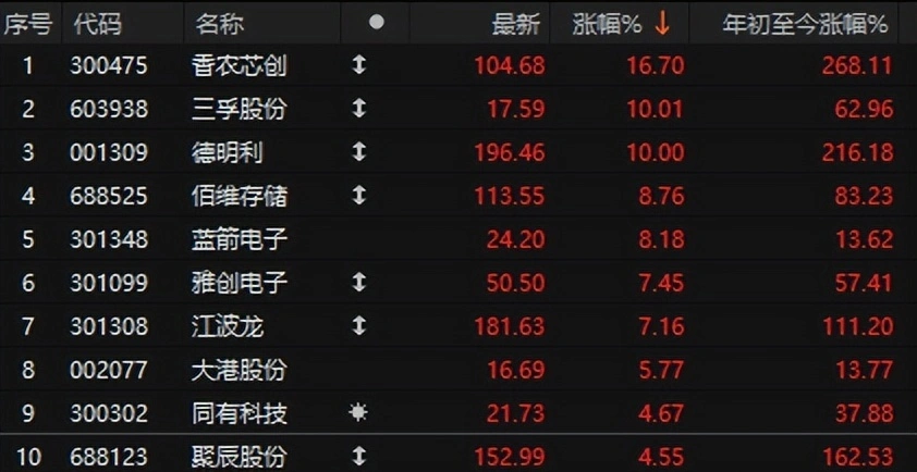另外,根据CFM闪存市场,现货NAND、DRAM供应周全 趋紧,周度存储价格再度全线上涨。SSD(SATA、PCIe)渠道、行业市场本周价格上涨达10-20%,DDR4/5 UDIMM、SODIMM本周价格上涨达10-20%,服务 器用DDR4 RDIMM内存条相较上月价格上涨达30-70%,DDR5 RDIMM上涨达10-25%。Wafer端来看,根据Bloomberg,至10月上旬,DDR4/DDR5颗粒周度价格持续上涨,相较8.29价格上涨8-45%,NAND TLC/QLC颗粒价格上涨0-12%。 昨晚美股闪迪暴涨超13%,今天A股存储板块暴涨,德明利、三孚股份涨停,喷鼻香 农芯创盘中一度涨停,收盘暴涨超16%。 ![]()
