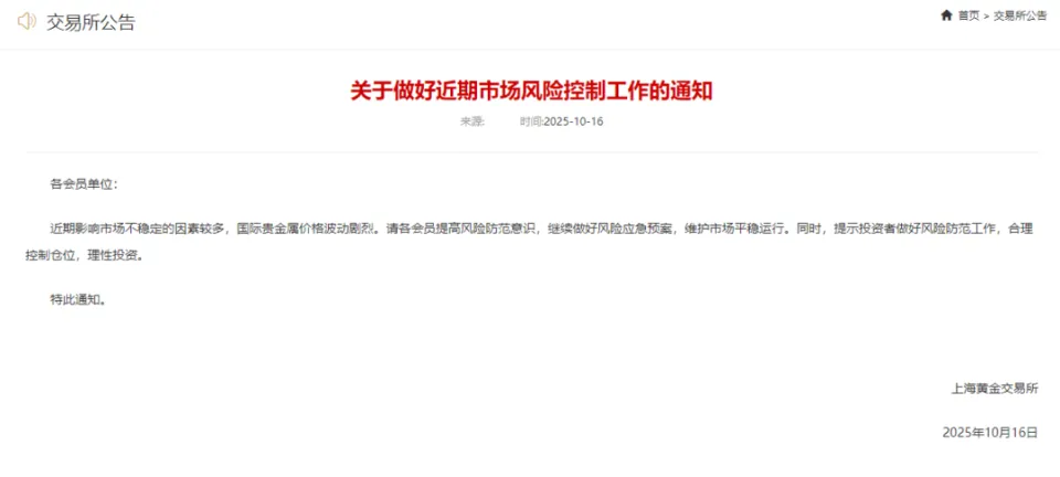 针对近期国际贵金属代价颠簸激烈 上海黄金生意业务所10月16日向各会员单元发布关于做好近期市场风险掌握 工作的关照近期影响市场不稳固的因素较多,国际贵金属代价颠簸激烈 。请各会员进步风险防备 意识,继承做好风险应