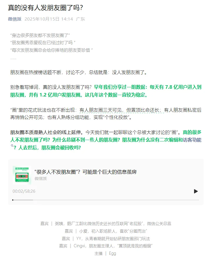 10月15日,“微信派”微信公众号发布文章《真的没有人发朋友圈了吗?》,回应朋友圈在热搜榜的相干话题。微信派表现,早年 微信分享过一组数据:天天有7.8亿用户进入到朋友圈,并有1.2亿用户发朋友圈。这几年这个数据