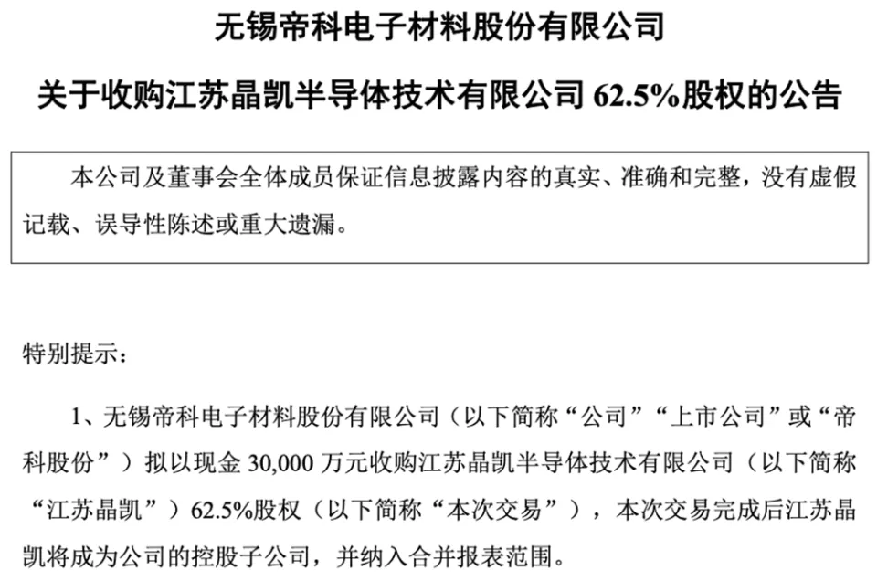 瞄准存储财产链闭环。 作者|ZeR0 编辑|漠影 芯东西 10月16日报道,10月14日,江苏无锡高性能电子材料上市公司帝科股份发布关照布告 称,拟以现金3亿元收购江苏徐州存储芯片公司江苏晶凯 62.5%的股权。 交易完成后,江苏晶凯将成为帝科股份的控股子公司,正式纳入合并报表范围。 帝科股份将依托已有存储业务对江苏晶凯的业务、管理团队以及资金运用等方面进行优化整合,以进步帝科股份的团体绩效。 2024年9月,帝科股份收购因梦控股。因梦控股重要专注于存储芯片运用 性开辟、方案计划和销售,具体产品包罗DDR4/LPDDR4/LPDDR5等DRAM存储芯片,产品运用 范畴覆盖OTT机顶盒、手机、平板电脑、条记本电脑以及各类消费电子产品。 江苏晶凯创立 于2020年11月,专注于存储芯片封装与测试制作 服务 以及存储晶圆分选测试服务 。 2024年,江苏晶凯的营收为9120万元,净利润为1355万元。 在存储芯片封装测试服务 方面,江苏晶凯接纳BGA、FCCSP&FCBGA等封装工艺以及DRAM存储芯片测试技术,为客户供给 机动多样的存储芯片封测方案。 该公司已经把握DRAM多层堆叠(8~16 层叠 Die)封装、30um超薄Die封装、多芯片集成(SoC+DRAM 合封)、SIP倒装封装以及WLCSP、Fan-out等先辈 封装技术及具备各规格DRAM芯片的全自动化制品测试、 老化测试能力。 伴随AI算力时代的到来,江苏晶凯可为互助同伴供给 定制化整合界面服务 、 先辈 封装材料与工艺导入、封装方案定制、产能配套等为一体的算力芯片“中心件”服务 。 在晶圆分选测试服务 方面,江苏晶凯重要根据客户需求经由过程 特定测试设备将存储晶圆进行测试后分级分类,属于封装前的工艺制程,可提拔存储芯片封测效率和制品良率,现在已可覆盖多家原厂DDR4/LPDDR4/LPDDR5晶圆的产品。 停止本关照布告 披露日,江苏晶凯股权布局如下: 交易完成后,江苏晶凯股权布局如下: 帝科股份控股子公司因梦控股业务发展 情况良好且具有良好的发展 远景。江苏晶凯覆盖存储芯片封装、测试制作 服务 及存储晶圆的测试分选服务 ,也是因梦控股存储芯片业务上游供给 商,与帝科股份现有存储芯片业务财产协同效应显著。 本次交易可实现帝科股份存储芯片业务财产链的美满布局,实现其存储芯片业务财产链局部闭环,构建从芯片运用 性开辟计划到晶圆测试、芯片封装及测试一体的产品开辟及处理能力,夯实存储业务核心竞争力,提拔帝科股份的恒久盈利能力。 |