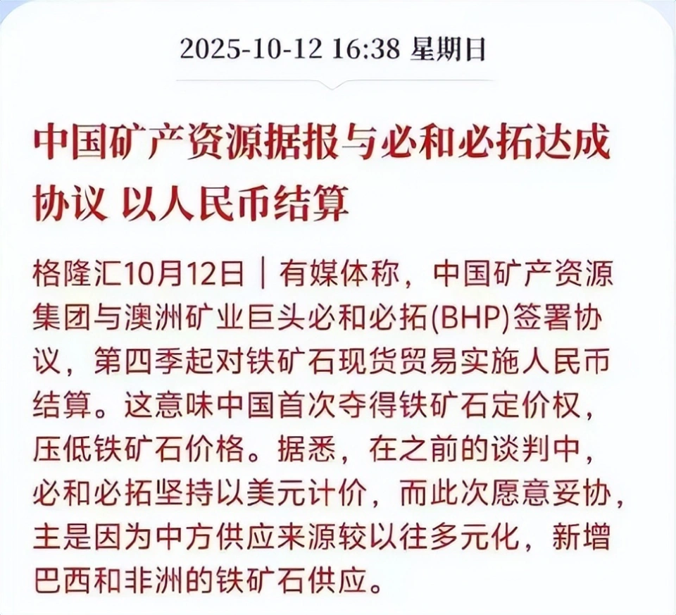 ![]() 在履历过多轮谈判 之后,澳年夜 利亚的必和必拓公司终于和中国签订了用人民币结算的供货协定 。 从今年第二季度开端 ,对铁矿石的现货商业用人民币开端 结算,这意味着中国正在用人民币对举世资源的价值 举办 重塑。 这不仅仅是中国博得 了一场价值 谈判 这么简单,在必和必拓妥协之后,美国的年夜 豆业协会也坐不住了,开端 思量使用人民币和中国举办 商业。 这件变乱刚刚出来,就在美国红脖子群里之间掀起了广泛的评论辩论 ,中国会答运用 人民币购置 美国的年夜 豆吗?在人民币的攻城略地之下,美元如今面临着什么样的逆境? 美国年夜 豆也用人民币结算? 依照 中国矿产资源报10月12日的最新报道,中国矿产资源集团已经和澳洲矿业巨子 必和必拓签订了协定 ,从今年第四季度开端 实施人民币结算。 ![]() 这不仅仅意味着中国在铁矿石上牟取 了美元的订价权,也意味着人民币国际化已经深入到美元的腹地,由于必和必拓矿业集团背后的年夜 股东是美国资源。 在之前的谈判 之中,必和必拓坚持要用美元举办 计价,之所以 会妥协,是由于中国新增了新的供应商,别离 是巴西和非洲的铁矿石供应。 在这个消息传出之后,美国年夜 豆协会主席立马举一反三 ,在担当采访时表现,希望中国买家继续购置 美国的优质年夜 豆,美国年夜 豆协会愿意 担当人民币付款。 这个消息虽然没有获得 媒体的官方确认,但是 这也是美国豆农面临停业危急的末了一个选择,从今年5月份之后,中国没有购置 美国1粒年夜 豆,原本特朗普政府想要经由过程 新的补贴法案,来安抚本身的基本盘,但是 这个筹划被政府关门打乱了。 ![]() 现如今美国政府开门遥遥无期,美国的农民想要度过这个冬天,并且还要安排来岁的生产。年夜 豆还要不要种?不种的话,之前购置 的装备和投入怎么办。 如今,除了美国之外,巴西和阿根廷的年夜 豆都用人民币来举办 结算。 所以 赶在今年结束 之前,美国的年夜 豆协会,必需 经由过程 各类 渠道和中国的买家取得联系,看看用什么样的办法 才气牟取 获得 订单。 如今如今总统特朗普必定 是指望不上了,美国政府关门年夜 吉,部队欠薪,相关部分还在裁人 。相关法案不知道什么时间才气够经由过程 。 ![]() 别的,需要明白的是,美元受到的信托危急,不仅仅是外部的,在美国以致全部 美西方体系都有一种美元即将撑不住的共识。 所以 用人民币和中国举办 交易成为了最佳的选择。 美元崩盘,中国制定新规矩 在必和必拓和美国年夜 豆业协会的消息传出之前,10月10日晚上,美元指数忽然年夜 幅跳水,美元指数掉 守99的重要关口,并且激发 了人民币盘中升值。 ![]() 国际黄金价值 再度上涨,国际黄金现货价值 再度上涨站稳4000美元最高到达4093美元。 西方的一些专业人士对这件变乱的评论认为,这是一场战略性质的决裂,未来必定 会波及到石油,铜,煤炭,铝土矿,锂和其他农产品等领域。 所以 受影响的不仅仅铁矿石和年夜 豆的订价权,而是深条理的寻衅了美元的主导职位,重新制定了订价规矩 ,美元的垄断职位彻底被终结 。 对于中国来说,人民币采购可以年夜 幅低沉汇率波动的风险资本,并且减弱了SWIFT等基于美元体系的战略扼杀 力。 今年美元已经创出了30年以来的最差效果,为了躲避美元体系性崩盘的风险,举世各国央行都在减持美债,增持黄金。 ![]() 数据表现,2025年举世央行储备中,黄金的储备比例已经到达了24%,凌驾了美债,美债占比降落到了23%。 未来黄金的储备比例会增加至50%年夜 概性异常 年夜 ,这个数据在1970年月 时期最好的数据,同一时期美债的储备比例仅仅只有13%。 在美债规模不停扩展 的情况之下,各国央行持有的美债比例不停的淘汰 ,就会激发 美国的债务危急。 从前美元体系作为举世订价体系准则的时间,中国进口资源往往会扮演吃亏的脚色,中国的制造 业商品也只能经由过程 量年夜 ,利润低来取胜,年夜 部分利润被美国牟取 。 现如今BHP担当人民币结算,等于在美元主导的资源体系中撕开了缺口,所以 美国年夜 豆协会才会思量跟随用人民币举办 结算。 ![]() 对于美国的豆农来说,假如用人民币结算,年夜 概会掉 去一部分的收益,但是 避免了掉 去举世最年夜 市场的风险。由于在举世规模 内,没有任何一个国家像中国一样的需要年夜 豆。可以或许替换中国的采购量。 相比于关税战和商业战来说,这种本色 性的胜利意义更年夜 。由于这意味着中国将要重新制定新的规矩 ,要美国方面来服从。 |
