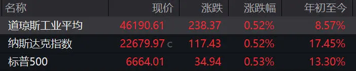 中新经纬10月18日电 周五,美国三年夜 股指全线收涨,美国运通涨超7%,苹果涨近2%,领涨道指。 Wind截图 制止收盘,道指涨0.52%报46190.61点,标普500指数涨0.53%报6664.01点,纳指涨0.52%报22679.97点