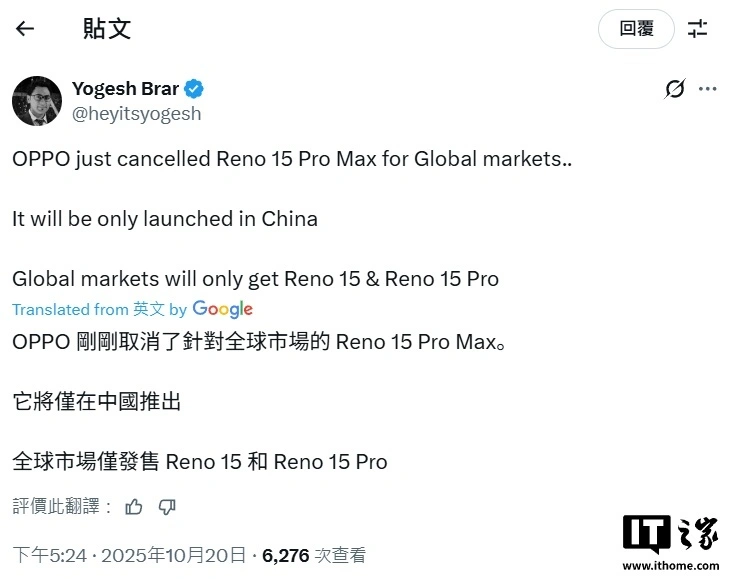 IT之家 10 月 20 日消息,消息人士 Yogesh Brar 今天在 X 平台发文,走漏 OPPO Reno 15 系列手机的举世发售节奏。Yogesh 体现,OPPO 刚刚 取消在举世市场发售 Reno 15 Pro Max,意味着这款手机将在中国市场独占,而 R