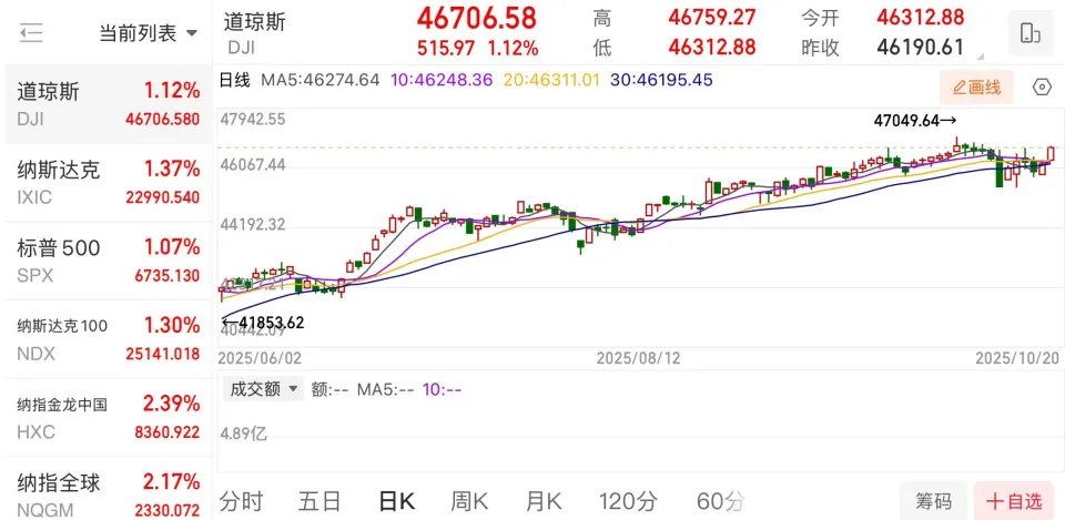 本地时光 10月20日,美股三大指数集团 上涨。停止收盘,道琼斯工业平均指数涨515.97点,涨幅1.12%,报46706.58点;纳斯达克指数涨310.57点,涨幅1.37%,报22990.54点;标普500指数收涨71.12点,涨幅1.07%,报6735.13点