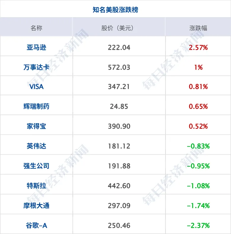 每经编纂 :陈鹏程,王晓波 1 隔夜市场 美股三大指数收盘涨跌不一 ,道指涨0.47%,标普500指数平收,纳指跌0.16%,其中,道指再创汗青新高;费城金银指数大跌9.57%;大型科技股涨跌不一 ,亚马逊涨超2%,英特尔、苹