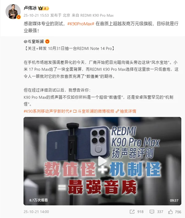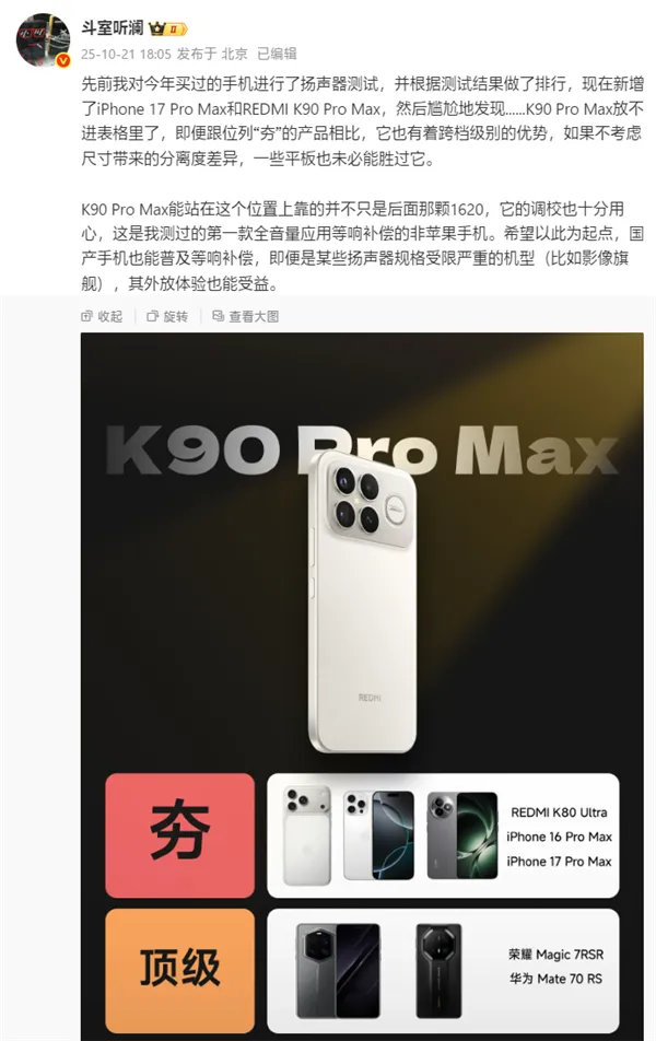 【TechWeb】去年11月尾,REDMI推出了其品牌升级后首款产物——REDMI K80系列,包含 REDMI K80和REDMI K80 Pro两个版本,一经表态便受到了用户的广泛 接待。而这段时光 以来,新一代的REDMI K90系列已经迎来麋集预热,将于10月23日也就是来日诰日表态,受到了不少用户的存眷 。现在有最新消息 ,近日小米集团总裁卢伟冰进一步带来了该机在音质上的更多细节。 ![]() ![]() 据小米集团总裁卢伟冰最新宣布 的信息显示,“K90 Pro Max在音质上超越友商万元级旗舰,目标就是行业最强!”联合此前相干爆料,该机将行业首发2.1扬声器,顶部和底部的对称双扬声器规格为1115,后摄旁边的扬声器为超年夜 尺寸1620,Sound by Bose团结调音,实现低音饱满 ,细节丰富,人声清晰。而专业音频博主斗室听澜测试之后给出了最强排名,同时还表现:“REDMI K90 Pro Max能站在这个位置上靠的并不只是反面那颗1620,它的调校也非常用心,这是我测过的第一款全音量运用 等响补偿的非苹果手机。”值得注意的是,陈奕迅担当REDMI声学年夜 使,并且 会在宣布 会上刊行 时隔25年重新录制的《K歌之王》。 ![]() 其他方面,按照 此前曝光的消息 ,全新的REDMI K90 Pro Max将搭载小米17 Pro Max同款的6.9英寸超级像素屏幕,采用全RGB分列。搭载高通第五代骁龙8至尊版平台,配备小米17同款高动态传感器——光影猎人950,这是REDMI迄今最强1/1.31英寸超年夜 底主摄,并且 还将配备潜望长焦镜头,这是REDMI K系列第一款拥有潜望镜头的旗舰,堪称史诗级年夜 升级。别的,该机将内置7560mAh小米金沙江电池,支撑 100W有线秒充、50W无线快充和22.5W反充,并周全 兼容100W PPS通用充电协议。 ![]() 据悉,全新的REDMI K90 Pro Max将于10月23日宣布 ,这是REDMI史上首款Pro Max机型。按照小米集团总裁卢伟冰的说法,K90 Pro Max是4000元+最强的产物,没有让步 的超强的产物力,必定 会通杀4000元+这个代价段。更多具体信息,我们拭目以待。 |
