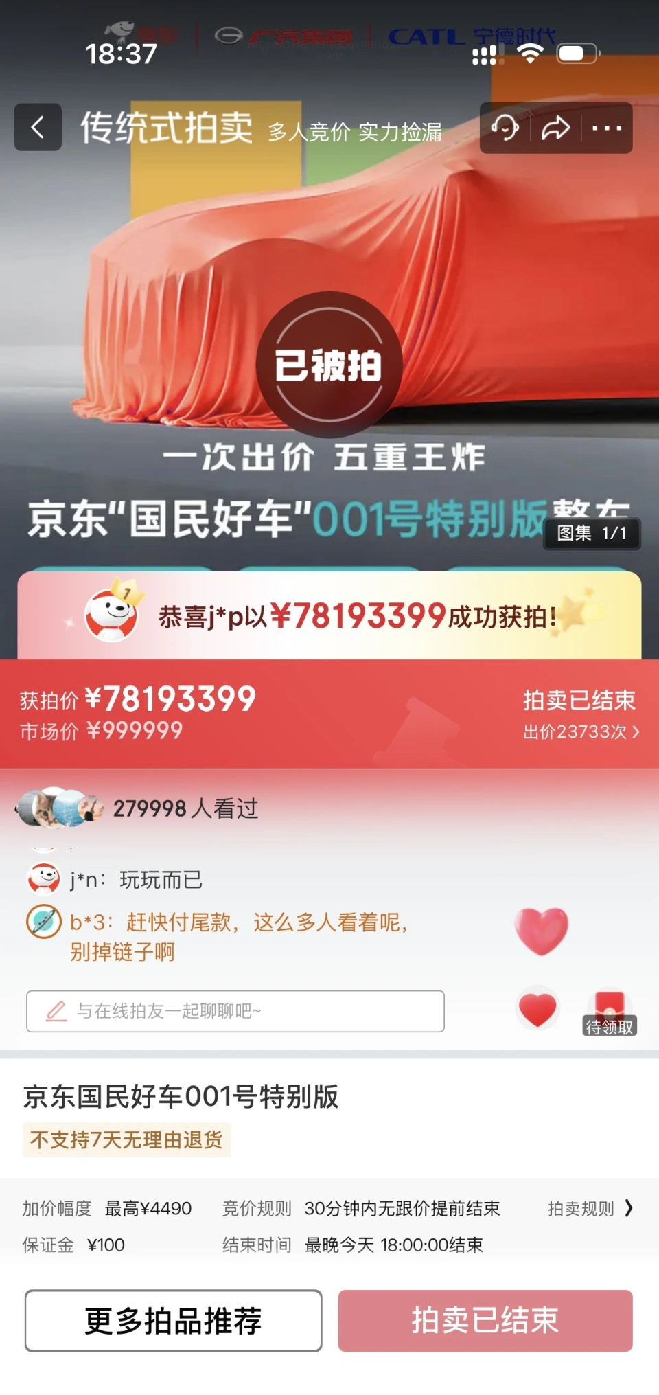 ![]() 10月22日,备受存眷 的京东“公夷易近 好车”001号特殊版整车正式开拍,随即演变为一场逾20万人围不雅 的“狂欢”。 当日14时,拍卖开始 后敏捷引发激烈竞价。从1元起拍价开始 ,开拍仅数秒,竞价便冲破 10万元年夜 关;1分钟内竞价高出80万元;不到一小时,出价已超2500万。 时代财经留意到,停止17时30分,这场拍卖吸引超20万人围不雅 ,出价涨至6300万元。终极,颠末4小时23000多次的激烈竞价,拍卖页面表现,某用户以7819万元的代价“成功获拍”。这一代价远逾越 此前市场对该车型10万至12万元的订价推测。 品评区内,有网友调侃“自己也是100元参与了上千万的生意”,另有网友表示“不上一个小目标,对不起我东哥的付出”。