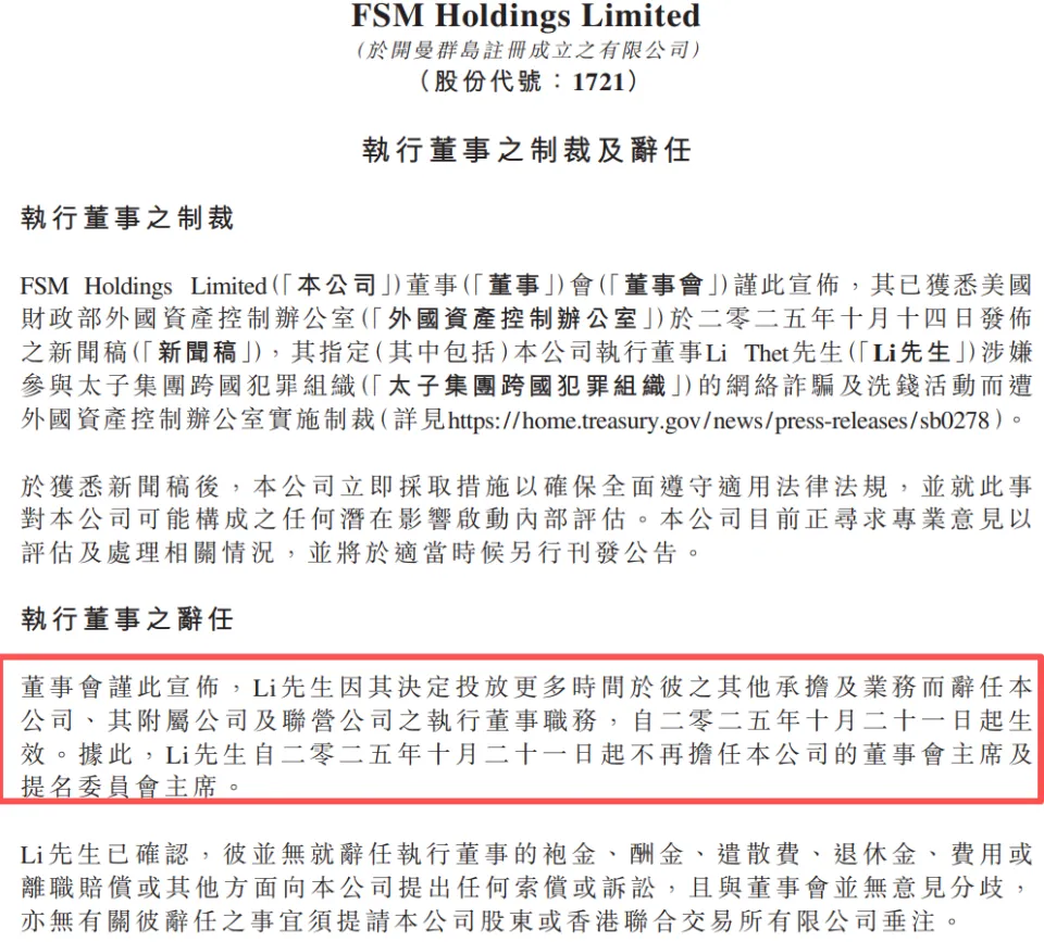 一个与柬埔寨太子团体关系亲密 的北京人,突然辞任港股上市公司董事长。 人们这才意识到,这个被英美两国点名制裁的跨国犯法 网络,早已寂静将触角伸向港股。 01 一纸突如其来的辞任公告 10月22日下午,香港上市公司FSM Holdings(1721.HK)宣布 公告,宣布公司实行董事兼董事会主席Li Thet因决议 投放更多时光 于其他事务而辞去全部职务,辞任自2025年10月21日起见效。
