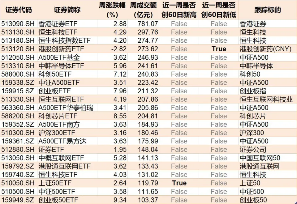 每经记者:叶峰 每经编纂 :肖芮冬 本周股指年夜 幅走强,沪指冲破 3950点,创近十年新高,逼近4000点年夜 关。 沪深两市股票型ETF和跨境型ETF本周合计净流出逾200亿元。行业主题上看,券商、死板 人等ETF被资金看好,而人工智能、新能源车干系ETF被资金抛售。 逾200亿资金借道 ETF离场 本周沪深两市成交8.9万亿元,其中沪市成交3.93万亿元,深市成交4.97万亿元。停止最新收盘,沪指报收于3950.31点,全周上涨2.88%,深证成指报收于13289.18点,全周上涨4.73%。 Wind数据表现,本周沪深两市股票型ETF和跨境型ETF合计净流出逾200亿元,行业主题ETF净流出212亿元。 ![]() 细分来看,紧张宽基指数整体资金申赎统计表现,本周上证50净流入8.84亿元,创业板指净流出55.28亿元。 ![]() 详细ETF方面,范围 较年夜 的10只宽基指数ETF本周合计净流出88.41亿元,其中创业板ETF净流出37.16亿元,沪深300ETF、科创50ETF净流出逾20亿元。 ![]() 本周紧张指数干系ETF表现 对于当前市场,有券商表现,市场政策预期升温,叠加美联储年内仍有降息空间,将对市场形成支撑 。当前A股市场年夜 概继承出现蓄势震动 的特性,在国内政策预期升温与三季报事迹 验证的支撑 下,布局性机会依然丰富。 券商、死板 人等ETF受资金追捧 在行业主题ETF方面,本周净流入资金超1亿元的基金有23只,其中券商ETF、死板 人ETF和养殖ETF分别 增加 了16.71亿份、7.01亿份和9.25亿份,净流入资金9.87亿元、7.06亿元和5.94亿元。 ![]() 在资金流出方面,本周有51只行业主题ETF净流出逾1亿元,其中人工智能ETF、新能源车ETF和半导体ETF份额分别 淘汰6.02亿份、3.36亿份和3.88亿份,分别 净流出资金8.81亿元、5.93亿元和5.9亿元。 值得留意的是,本周券商板块得到资金存眷 ,券商ETF(512000)份额增加 了16.76亿份,基金份额周内触及649.19亿份,创上市新高。 ![]() 券商ETF(512000)基金份额变革 有机构分析表现,低利率环境下,资金加速向权益市场迁移,持续带来增量资金。陪伴市场扩容及活泼度提升,券商各项营业 迈上新台阶,红利 能力稳步提升。但板块估值仍处相对低位,如今是把握券商板块战略 性修复机会的症结 时期。 别的,死板 人ETF(562500)近期也持续受到资金追捧,份额升至226.54亿份,创上市新高。 ![]() 死板 人ETF(562500)基金份额变革 在机构看来,人形死板 人板块目前已回吐9月累计涨幅,短期调解或紧张由于外部扰动下,科技成长 主线走弱,前期板块获利资金了结 。当前因活动性波动 导致的回调或是买点,三季报事迹 及死板 人营业 希望超预期的个股成设置首选。 22只ETF周成交额超100亿元 本周,股票型ETF和跨境型ETF成交额超100亿元的ETF有22只。 ![]() 其中,喷鼻 港证券ETF周成交额超700亿元。 别的,港股立异 药ETF创近60日新低。 有分析认为,历经十年转型,中国立异 药产业已逐步迈入收获兑现期。当前,国产立异 药获批上市数量稳步上升,出海生意营业 屡爆年夜 单,立异 药板块有望是热门凹凸 切作风 下的资金选择。 6只ETF下周发行 基金重仓股素来 是投资者存眷 的热门,然则 主动管理型基金的重仓股浮出水面,通常都有肯定的滞后性,而ETF布局的标的却好坏常明确的,通过跟踪新上市ETF,通常可以发现近期热门个股,新上市ETF带来的增量资金也值得存眷 。 目前有1只ETF披露下周上市,跟踪标的为上证180等。 ![]() 目前有6只ETF披露下周发行,跟踪标的有中证卫星产业、恒生科技、光伏产业、港股通信息技术、工业软件等。 ![]() 每日 经济新闻 |