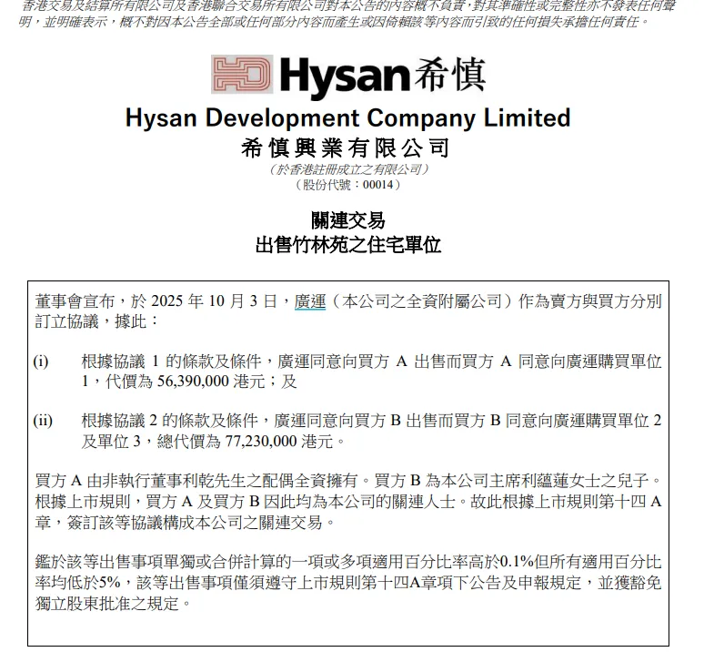 10月24日,希慎兴业(00014.HK)通知布告 称,本公司全资从属 公司广运作为卖方与买方Verdant Peak Investment Limited订立协议 ,出售位于竹林苑的一个住宅单位,该单位适用 面积约2084平方呎(约合193平方米),代价为5354万港元。买方由独立非执行董事张勇老师全资拥有,依照 上市规则,该生意营业 组成 关联生意营业 。 ![]()
