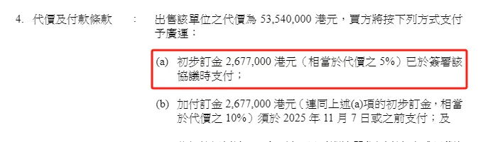 依照 协议 ,买方须于签署协议 时支付开始 订金267.7万港元(占代价5%),并于2025年11月7日或之前支付加付订金267.7万港元(连同开始 订金共占代价10%),余款将于2026年1月24日完成日或之前支付。