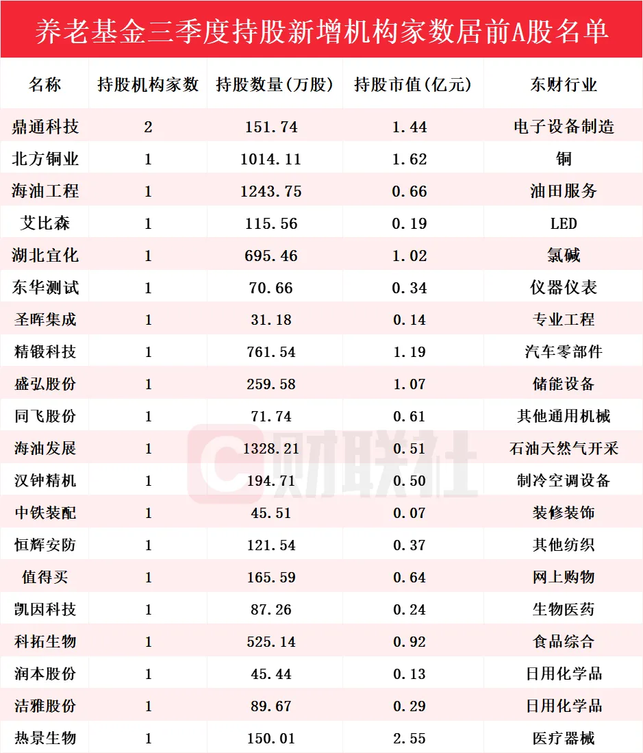 财联社10月26日讯(编辑 笠晨)近期,A股上市公司三季报加速披露,前十大流通股东数据泄漏 出机构行踪。Choice数据表现,停止发稿,养老基金三季度新进入20家个股的前十大流通股东名单。 此中,鼎通科技新增养老基金