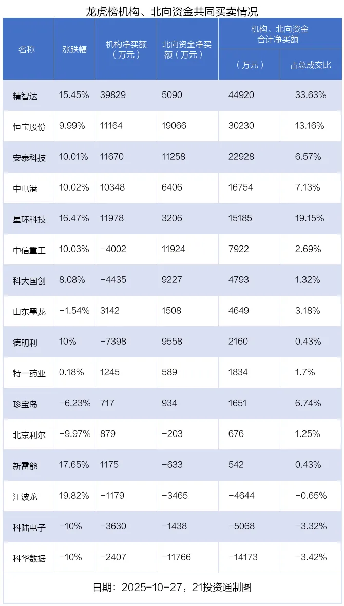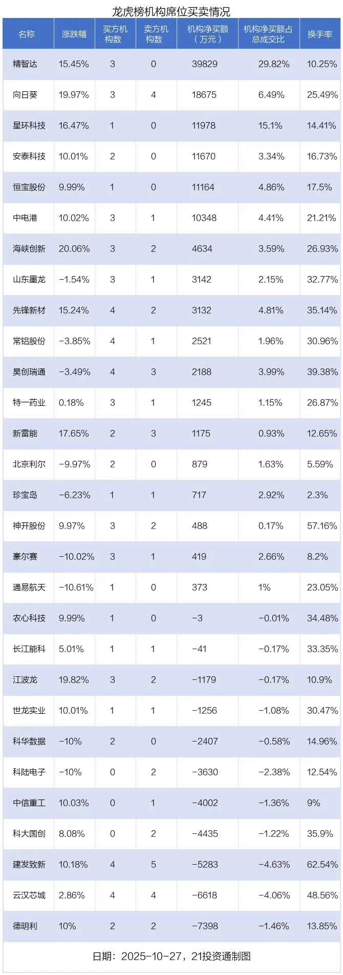 10月27日,上证指数上涨1.18%,深证成指上涨1.51%,创业板指上涨1.98%。盘后龙虎榜数据体现,共有50只个股因当日异动登上龙虎榜,资金净流入最多的是恒宝股份(002104.SZ),达5.06亿元。 据21投资通智能监测,29只个股龙虎榜出现了机构的身影,北向资金参与龙虎榜中的个股共涉及22只。 5.06亿资金抢筹恒宝股份,4.71亿资金出逃科华数据50只上榜的龙虎榜个股中,24只个股被净买入,26只个股被净卖出。其中,资金净买入最多的是恒宝股份,达5.06亿元,占总成交金额的22.04%。恒宝股份当日收盘上涨9.99%,换手率为17.5%。 ![]() 而龙虎榜中资金净流出最多的是科华数据(002335.SZ),被净卖出为4.71亿元,占总成交金额的11.36%。科华数据收盘下跌10%,换手率为14.96%。 ![]() 机构净买入18股,净卖出11股10月27日,29只个股龙虎榜出现了机构的身影,机构合计净买入8.83亿元。具体来看,机构净买入18股,净卖出11股。 其中,机构净买入金额最多的是精智达(688627.SH),当日收盘上涨15.45%,换手率为10.25%。 ![]() 机构净卖出的个股中,金额最多的是德明利(001309.SZ),当日收盘上涨10%,换手率为13.85%。 北向资金净买入15股,净卖出7股10月27日,北向资金参与龙虎榜中的个股共有22只,合计净买入8.18亿元。其中沪股通净买入8 股,净卖出1 股,合计净买入4.32亿元;深股通净买入7 股,净卖出6 股,合计净买入3.86亿元。 北向资金净买入金额最多的是伟测科技(688372.SH),净买入2.32亿元,占总成交金额的10.74%。净卖出金额最多的是华建集团 (600629.SH),为1.65亿元,占总成交金额的3.88%,当日收盘下跌9.99%,换手率为16.42%。 ![]() 值得注意的是,机构和北向资金配合 净买入了恒宝股份、安泰科技、中电港、精智达、星环科技、山东墨龙、珍宝岛、特一药业等8股;配合 净卖出了科陆电子、江波龙、科华数据等3股;在中信重工,德明利,科大国创,北京利尔,新雷能上出现不合 ,机构净卖出中信重工4001.82万元,北向资金净买入1.19亿元;机构净卖出德明利7397.84万元,北向资金净买入9557.56万元;机构净卖出科大国创4434.65万元,北向资金净买入9227.48万元;机构净买入北京利尔878.58万元,北向资金净卖出202.77万元;机构净买入新雷能1174.74万元,北向资金净卖出632.89万元。 ![]() (声明:文章内容仅供参考,不构成投资建议。投资者据此利用,风险自担。) |