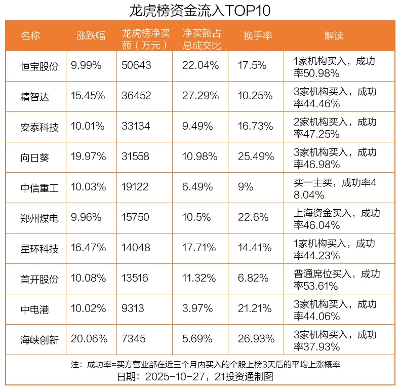 10月27日,上证指数上涨1.18%,深证成指上涨1.51%,创业板指上涨1.98%。盘后龙虎榜数据体现,共有50只个股因当日异动登上龙虎榜,资金净流入最多的是恒宝股份(002104.SZ),达5.06亿元。据21投资通智能监测,29只个