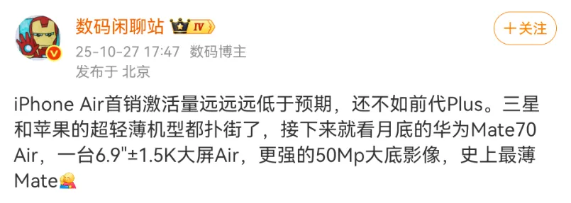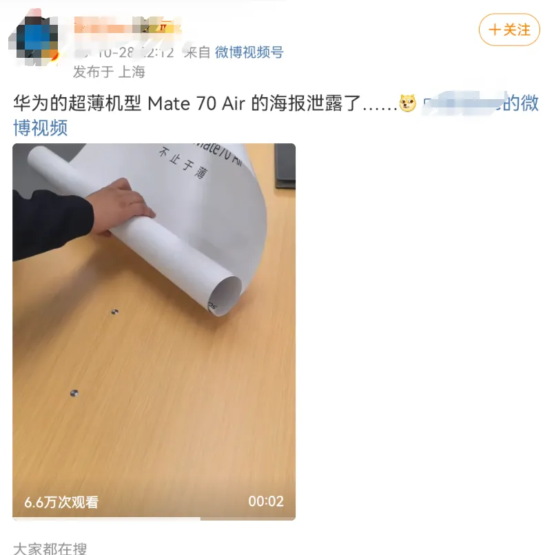 iPhone Air推出后,各家的“Air们”陆续都来了。10月28日,有博主晒出了两张华为Mate 70 Air的宣扬 标语以及实机背部计划。Mate 70 Air 宣扬 标语为“不止于薄”;从曝光的新机背部图片来看,Mate 70 Air却是很薄,背