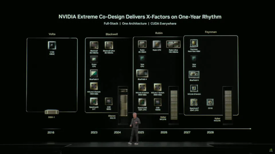 会黄仁勋华盛顿演讲 IT之家 10 月 29 日新闻 ,在华盛顿举行的 GTC 2025 年夜 会上,英伟达 CEO 黄仁勋初次公开展示了其下一代 Vera Rubin 超等芯片(Superchip)。 ![]() 其主板整合了一颗 Vera CPU 与两颗巨年夜 的 Rubin GPU,并配备了最多 32 个 LPDDR 内存插槽,同时 GPU 上还将采用 HBM4 高带宽显存。 ![]() ![]() 黄仁勋表示,Rubin GPU 已经回到实验室进行测试,这是由台积电代工生产的首批样品。每颗 GPU 拥有 8 个 HBM4 接口及两颗与光罩巨细雷同的 GPU 焦点芯片(Reticle-sized dies)。此外,Vera CPU 搭载 88 个定制 Arm 架构焦点,最高可支撑 176 线程。 ![]() 按照英伟达的规划,Rubin GPU 有望在 2026 年第三或第四季度进入量产阶段,时光 年夜 致与现有的 Blackwell Ultra“GB300”Superchip 平台全面 量产相称或更早。 ![]() 英伟达的 Vera Rubin NVL144 平台 将采用两颗新芯片组合,此中 Rubin GPU 由两颗 Reticle 尺寸的焦点构成,具备 50 PFLOPS(FP4 精度) 的算力,并配备 288 GB HBM4 显存。配套的 Vera CPU 供给 88 个定制 Arm 焦点、176 线程,NVLINK-C2C 互联带宽可达 1.8 TB/s。 ![]() 机能 方面,Vera Rubin NVL144 平台可实现 3.6 Exaflops(FP4 推理) 与 1.2 Exaflops(FP8 练习) 的算力,相较 GB300 NVL72 提升约 3.3 倍;体系总显存带宽达 13 TB/s,快速存储容量为 75 TB,别离 比上一代提升 60%,并具备双倍 NVLINK 与 CX9 通信 能力,最高速度 别离 为 260 TB/s 与 28.8 TB/s。 ![]() 英伟达还计划在 2027 年下半年 推出更高端的 Rubin Ultra NVL576 平台。该体系将 NVL 规模从 144 扩年夜 至 576,CPU 架构保持不变,而 GPU 将进级 为四颗 Reticle 尺寸焦点,机能 最高达 100 PFLOPS(FP4),并搭载 1 TB HBM4e 显存(IT之家注:散布 于 16 个显存接口)。 ![]() 机能 方面,Rubin Ultra NVL576 平台可实现 15 Exaflops(FP4 推理) 与 5 Exaflops(FP8 练习) 算力,相较 GB300 NVL72 提升 14 倍;其 HBM4 显存带宽达到 4.6 PB/s,快速存储容量达 365 TB,别离 为上一代的 8 倍,NVLINK 与 CX9 通信 能力则提升至 12 倍与 8 倍,最高速度 别离 达到 1.5 PB/s 与 115.2 TB/s。 |