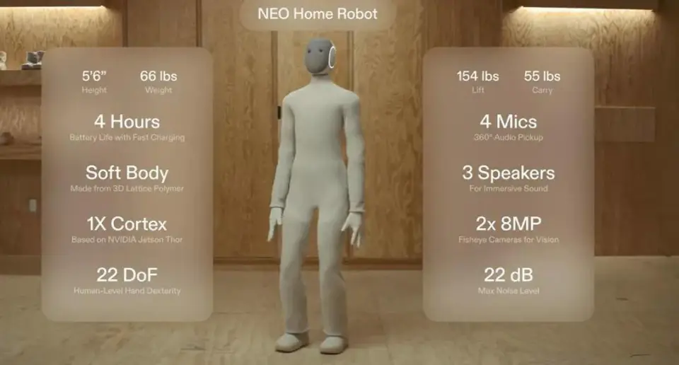 作为一款专为家庭场景计划的双足呆板人,NEO 主打安全 、陪同、干家务。 它身高 168 厘米,体重才 30 公斤,非常轻巧 。 为了不让用户对它产生非分之想,它的外形被计划成一个类似穿着 Lululemon的击剑锻练,完全看不出性别特性。