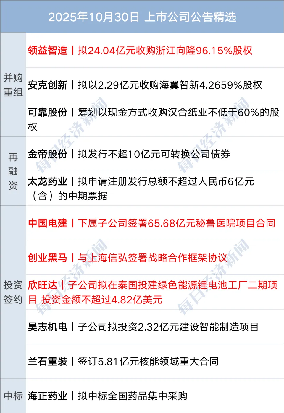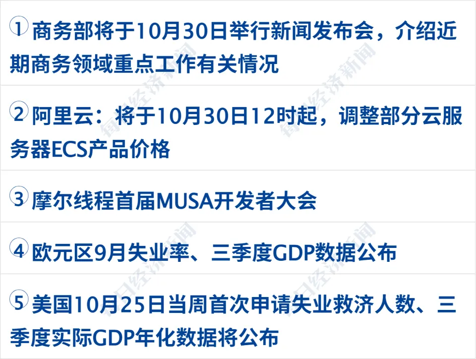 每经编辑:张喜威,王晓波 ![]() ![]() ![]() 1 习近平将同美国总统特朗普举行碰面 10月29日,交际部谈话 人宣布:经中美双方商定,国家主席习近平将于当地韶光 10月30日在韩国釜山同美国总统特朗普举行碰面,就中美关系和双方配合 关心的标题互换看法 。(央视消息) 2 隔夜市场 当地韶光 10月29日,美联储宣布将联邦基金利率目的区间下调25个基点到3.75%至4.00%之间。这是美联储继9月17日降息25个基点后再次降息,也是自2024年9月以来第五次降息。 美联储主席杰罗姆·鲍威尔在消息宣布 会上表现,美联储将继续根据最新数据、不停变化的经济远景以及风险平衡来确定适当的钱币政策态度。针对12月的政策走向,本次委员会会议的评论辩论 中存在着截然差别的看法。12月是否进一步降息远未成定局。 鲍威尔指出,美国政府“停摆”将“对经济活动造成影响”。别的,鲍威尔提到,很大一部分美国斲丧者仍然对通货膨胀“感到非常 不满”。 美股三大指数收盘涨跌纷歧 ,纳指涨0.55%,标普500指数平收,道指跌0.16%;英伟达涨约3%,总市值站上5万亿美元大关,这也是首家市值突破5万亿美元的上市公司;苹果小幅上涨,首次 收盘总市值超4万亿美元;谷歌涨超2%,续创新高;亚马逊、Meta、特斯拉小幅上涨;英特尔、微软、奈飞小幅下跌;卡特彼勒涨12%,创2009年以来最大单日涨幅。纳斯达克中国金龙指数基本平收,中概股涨跌纷歧 ,小马智行跌超3%,爱接纳跌超2%,理想汽车跌1.64%;阿里巴巴涨近2%,哔哩哔哩涨超1%。 现货黄金跌0.56%,报3929.66美元/盎司;COMEX黄金期货跌1.04%,报3941.7美元/盎司;COMEX白银期货跌0.1%,报47.275美元/盎司。 国际油价小幅收涨,美油主力合约涨0.35%,报60.36美元/桶;布伦特原油主力合约涨0.64%,报64.24美元/桶。 欧洲三大股指收盘涨跌纷歧 ,德国DAX指数跌0.64%报24122.67点,法国CAC40指数跌0.19%报8200.88点,英国富时100指数涨0.61%报9756.14点。 3 何立峰访谒 中国证监会国际顾问委员会委员时指出:中国正进一步深化资本市场改造 开放 中共中央政治局委员、国务院副总理何立峰29日在钓鱼台国宾馆访谒 中国证监会国际顾问委员会委员时表现,中国正全面贯彻落实中共二十届四中全会精神,进一步深化资本市场改造 ,毫不 屈从 扩大金融领域高水平对外开放,以金融高质量发展服务中国式当代化,接待更多外资金融机构和长期资本来华投资兴业。中国证监会国际顾问委员会委员高度赞美 频年 来中国资本市场改造 开放取得的结果,看好中国经济和资本市场发展远景,愿继续深耕中国市场,一连扩大对华投资互助。(新华社) 4 交际部:希望美方以现实办法掩护 环球产供链安定 10月29日,交际部谈话 人郭嘉昆主持例行记者会。有记者就黄仁勋日前表现美国AI芯片必要向中方出口一事提问。对此,郭嘉昆表现,具体标题建议向中方的主管部门进行询问。中方已多次表明 在美输华芯片标题上的原则态度,希望美方以现实办法掩护 环球产供链的安定 。(央视消息) 5 五部门印发《都会商业提质办法方案》 10月29日,商务部等5部门宣布 《都会商业提质办法方案》。请求 完整 准确全面贯彻新发展理念,卖力 践行人平易近 都会理念,对峙都会内涵式发展,团结一连推动 都会更新,实行都会商业提质办法,构建以天下树模步行街(商圈)为引领、特点 商业街区为支撑 、一刻钟便平易近 生活圈为底子,布局合理、设施齐全、业态丰富、供给优质、安全便利的都会商业系统 ,引发都会商业发展内生动能,释放多样化、差别化斲丧潜力,助力经济高质量发展。(央视消息) 6 国家外汇局推出3方面9条政策步伐服务跨境商业 国家外汇办理 局10月29日对外宣布 3方面9条政策办法,进一步增进 跨境商业收支便利化,积极支撑 对外商业发展。国家外汇局经常项目办理 司副司长张玉青先容,这3方面包罗推动 商业便利化政策在试点地域和业务种类上的“双扩围”、支撑 商业新业态结算便利方面“再升级”、助力服务商业资金使用“提质效”。(新华社) 7 央企战略性新兴产业发展专项基金启动,首期规模达510亿元 10月29日,由国务院国资委提议 ,委托中国国新设立和办理 的中央企业战略性新兴产业发展专项基金在北京启动,现在该基金已具备投资条件,将助力战略性新兴产业加快发展。基金首期规模达510亿元,其中 中国国新拟出资约150亿元。该基金投资期为5年,办理 和退出期为8年,其中 投资期最多可延长2年,合计15年。该基金作为国务院国资委推动 中央企业战略性新兴产业加快发展的专项基金,将支撑 国资央企补齐产业短板弱项、布局前沿创新,进一步增强核心功能 、提拔核心竞争力。将重点支撑 人工智能、航空航天、高端装备、量子科技等战略性新兴产业以及未来能源、未来信息、未来制作 等未来产业重点领域。(央视消息) 8 北京证监局等六部门宣布 政策吸引中长期资金入市 10月29日,中国证券监督办理 委员会北京羁系局一级巡视员吴智伟在“金融街宣布 ”专场活动上表现,北京证监局团结市委金融办、市人力资本 社会保障局、市国资委、人平易近 银行北京市分行、北京金融羁系局出台了《北京市推动 中长期资金入市的实行看法 》(以下简称《实行看法 》)。吴智伟说,《实行看法 》对峙目的导向、标题导向,以各本能机能 单元、相关企业的职责作为重点,团结北京地域发展现实和资本 天禀,提出了推动 中长期资